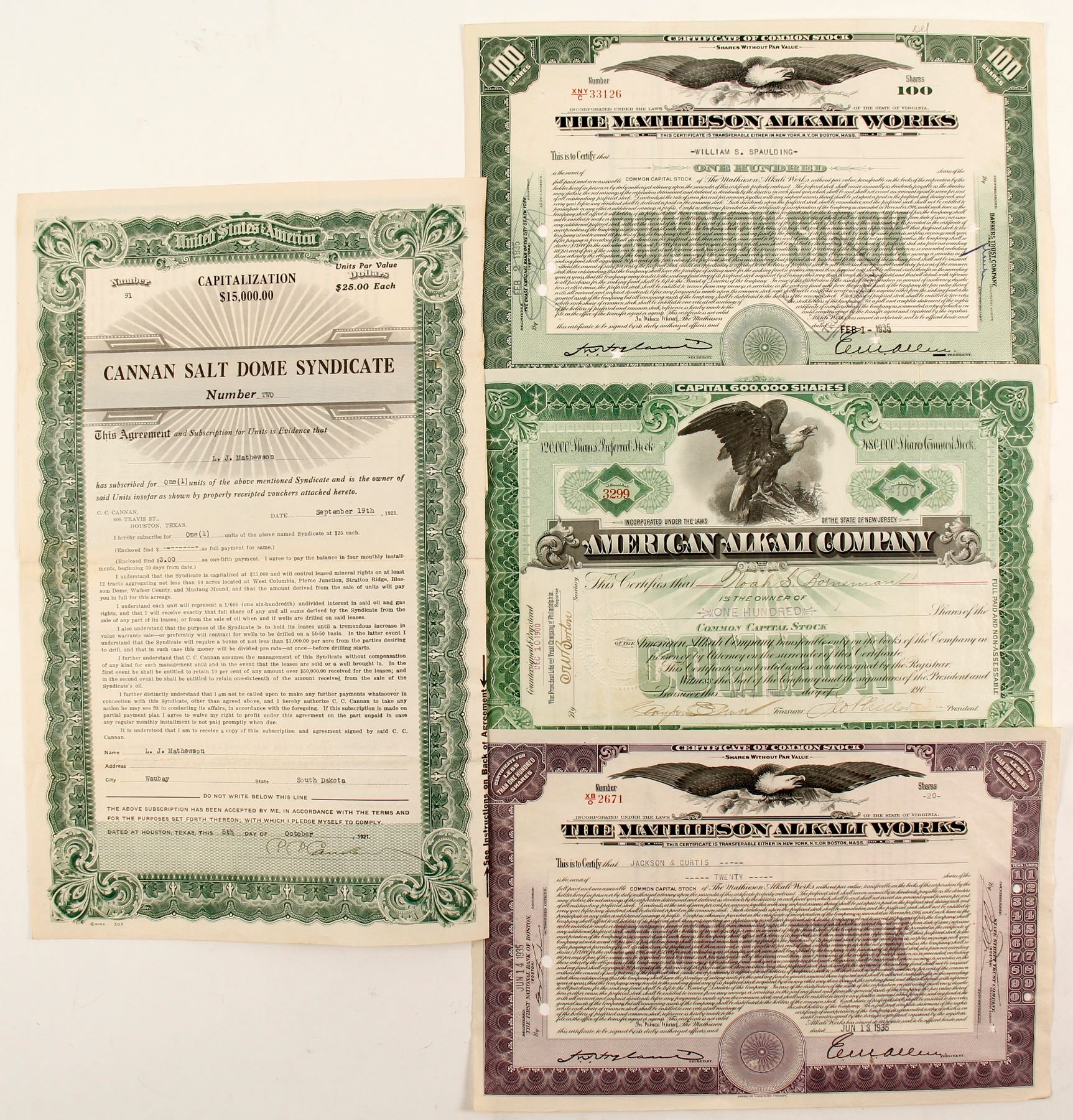 Three stock certificates and one bond: 1) 20 cancelled shares of Mahieson Alkali Works cert # XB/0 2671 issued to Jackson & Curtis. Assigned April 9, 1936. Printed: American Bank Note Co. 2) 100 shares of American Alkali Co cert. #3299 issued to Noah S. Borneman, date Dec. 7, 1900, countersigned and registered Dec 10, 1900. Raised company seal. Printed: American Bank Note Co., Phila. 3) 100 shares of cancelled Mathieson Alkali Works, cert #XNT/C 33126 issued to William S. Spaulding on Feb 1, 1935, registered Feb 2, 1935. Printed: American Bank Note Co. 4) 1 unit of Cannan Salt Dome Syndicate , number 91 Unit Agreement #2 issued to L. J. Mathewson, dated Sept 19th, 1921. 6 coupons attached. Printed: GOES 309. Ken Prag Collection