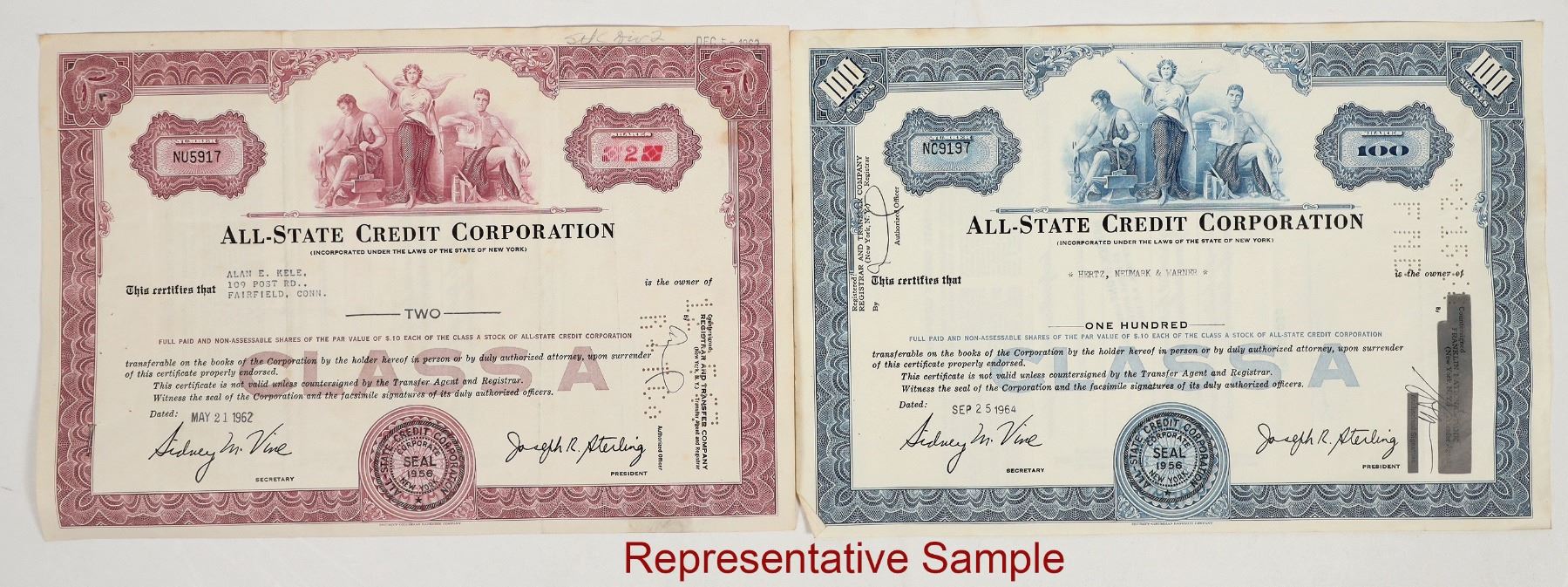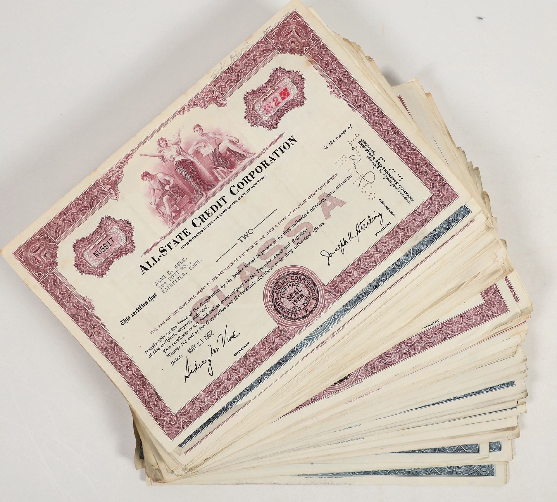 All-State Credit Corp. stocks group, approx. (200) certificates, (2) varieties, issued 1962-1964. See photos.