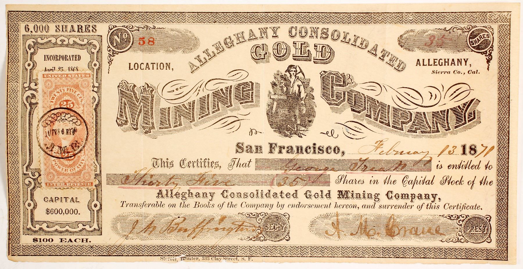 # 58 for 35 shares to George Trea(?). Signed by Buffington and president AM Crane. Dateline San Francisco 1871. Incorporated April 25, 1868. Not cancelled. 25c Power of Att'y revenue stamp. Small miner with pick vignette. Tears and rips bottom border. Otherwise excellent. Sterett printer. In 1869 the Maryville Daily Appeal reported the Alleghany was working the Blue Lead and had struck considerable pay dirt 780' from the mouth of the tunnel. The tunnel was 7' high and 6' wide, "large enough to use mules for drawing the car." Alleghany is home to the famous 16:1 Mine. Prag Collection State: California City: Sierra County, Alleghany Date: 1871