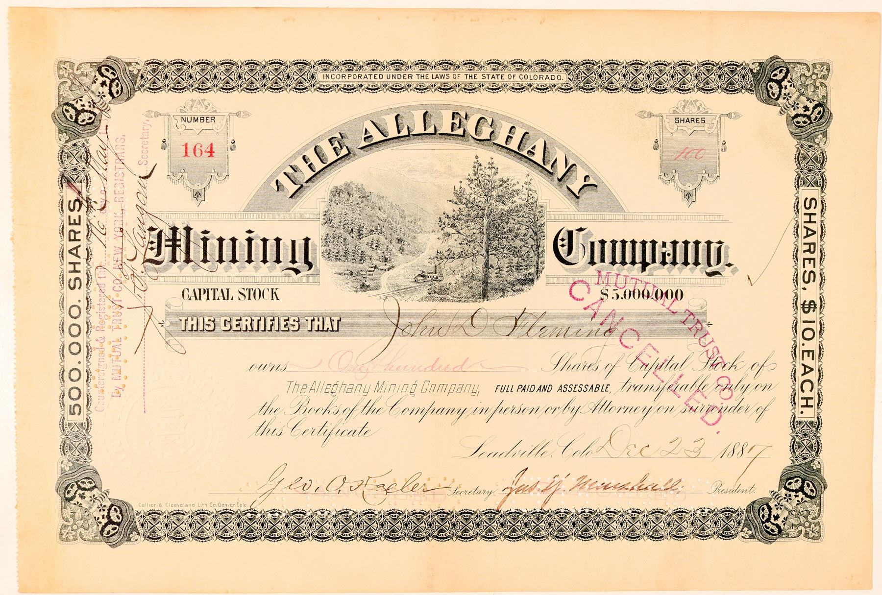 Inc. in Colorado. No 164, issued for 100 shares to John D. Fleming in Leadville on Dec. 23rd, 1887. Signed by president Marshall and secretary Keeler. Stamp and punch cancelled. Vignette of mine in a forest. Printed by Collier & Cleaveland Lith., Denver. Folds, some smudges/soiling. 7.5 x 11" The property was located on Yankee Hill with five shafts, each 300 feet deep [Burchard, C & L] () Ken Prag Collection