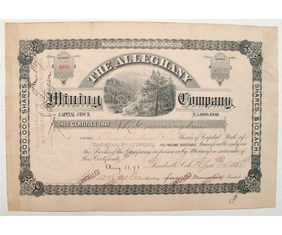 Incorporated in Colorado. Cert. #466, issued to J.L. Cunningham for 100 shares. Signed by James Marshall, president, and Geo. O. Keeler, secretary. Endorsed by J.L. Cunningham on the reverse and witnessed by Mr. Allan Emery in a transfer to Henry M. Geer. Cancelled by purple stamps across signatures. Embossed seal. Printer: Collier & Cleveland Litho. Co., Denver. Datelined Leadville. The property was located on Yankee Hill with five shafts, each 300 feet deep [Burchard, C & L]. Faint staining on margins and light creasing. VF.