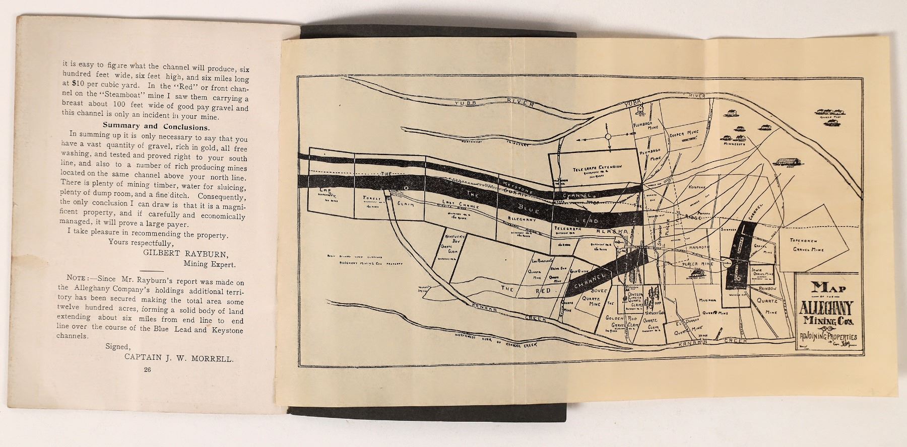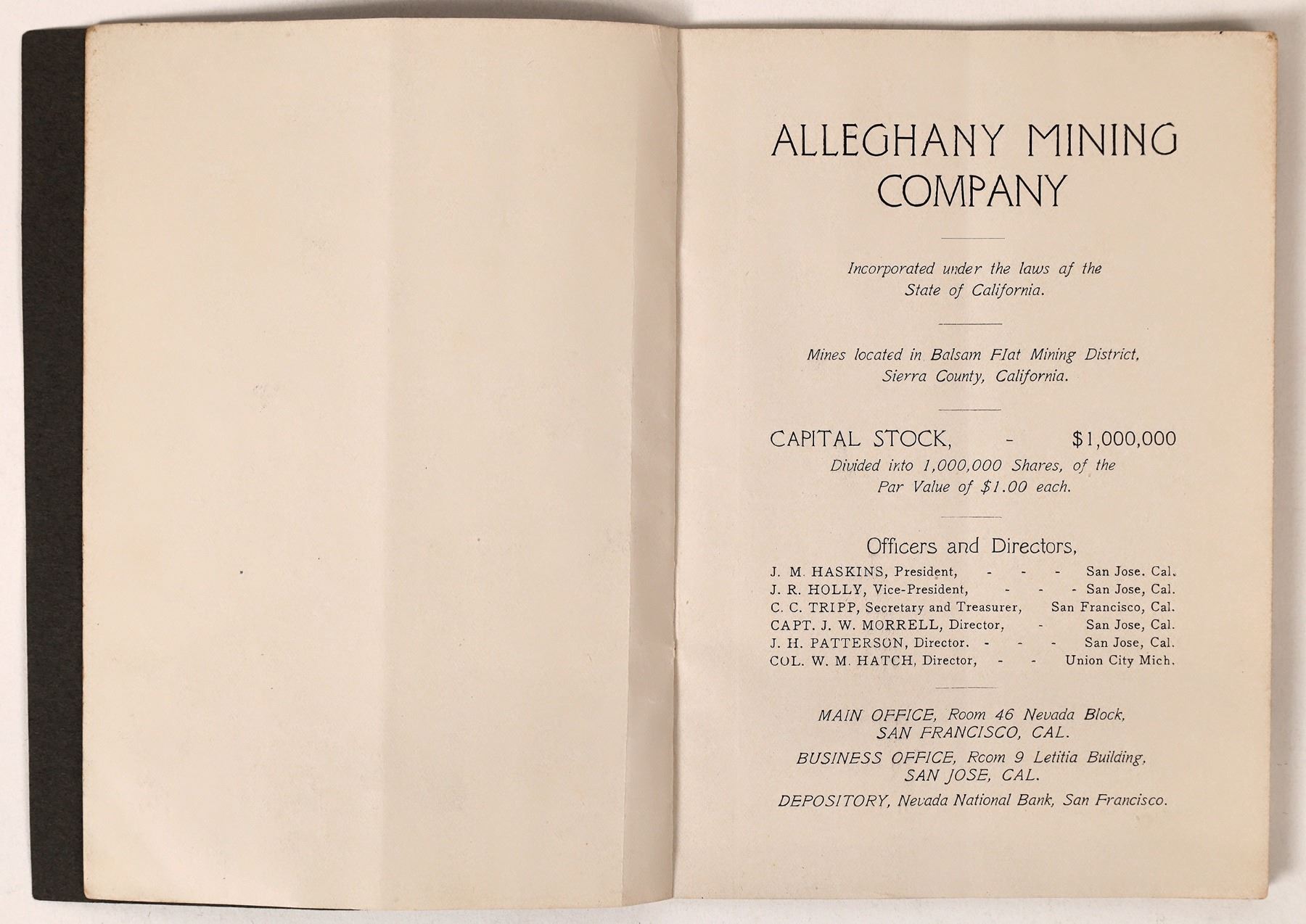 Allegheny, California is also the site of the famous Sixteen-to-One mine in California. It is located in Sierra County. Allegheny was one of California's early gold rush towns and the Allegheny Company tunnel was begun in April, 1853 (Gudde). The town was located on Kanaka Creek, just south of Downieville. Among the rich lode mines at Allegheny, the largest was the Sixteen-to-One mine which produced over $25 million thru the 1960's. This prospectus is quite rare from 1904. The company's property ran parallel to the noted Bald Mountain mine, which produced over $9 million. Twenty six pages in all plus a fold out claim map inside the back cover. The prospectus had been folded at one time but otherwise the condition is very good and it is tightly bound.