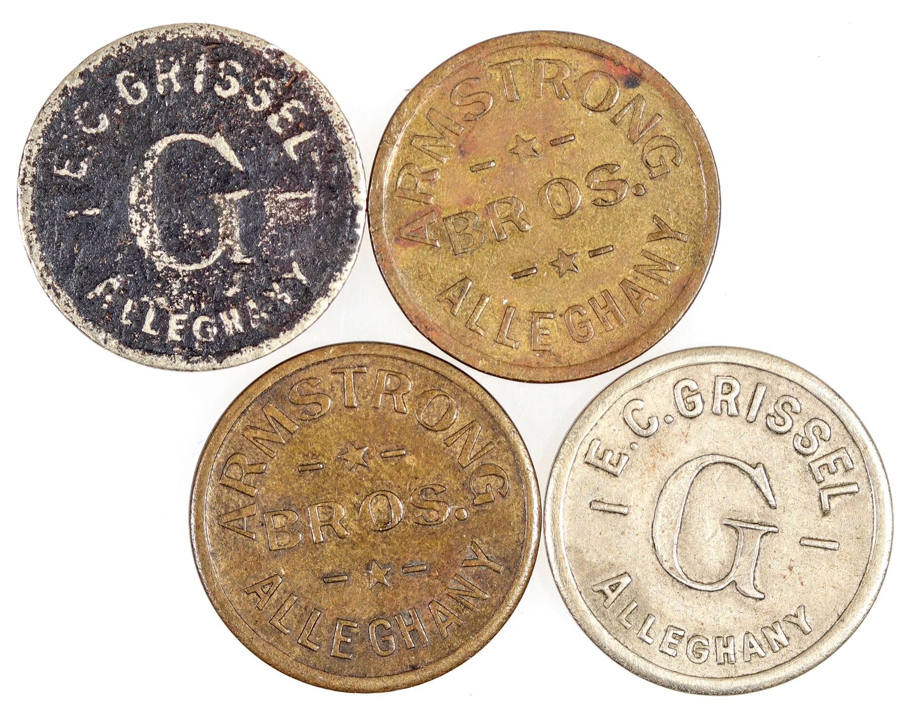 4 Allegheny tokens. 2x Very rare E C Grissel, 2x Armstrong Bros. Allegheny California