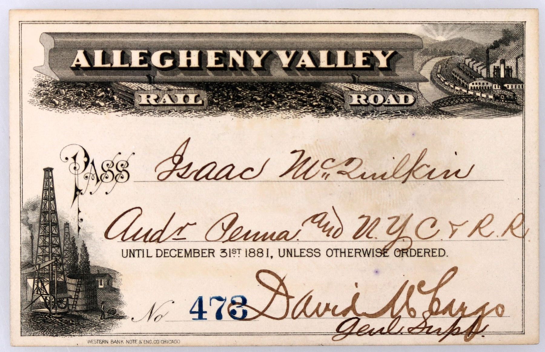 Very attractive! Pass no. 473, issued for 1881 to Isaac McLuilkin, auditor for the P&NYCRR. Signed by general superintendent David Cargo. Highly pictorial pass with vignette of train near plant (upper right), oil derrick (bottom left), and railroad tie with company name (top center). Printed on cardstock by Western Bank Note Co. Light wear. This railroad was established in the 1850s. Part of the Pennsylvania Railroad System. Followed the present company's tracks to Arnold and continued beyond, along the right upstream (southeastern) bank of the river to Oil City.