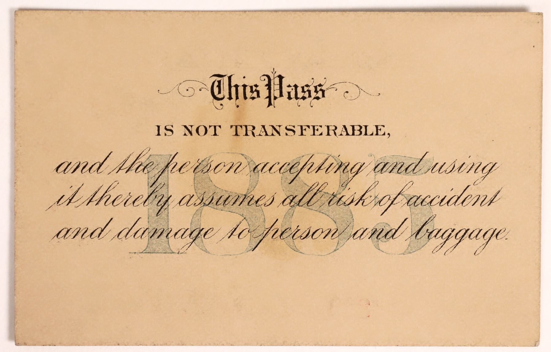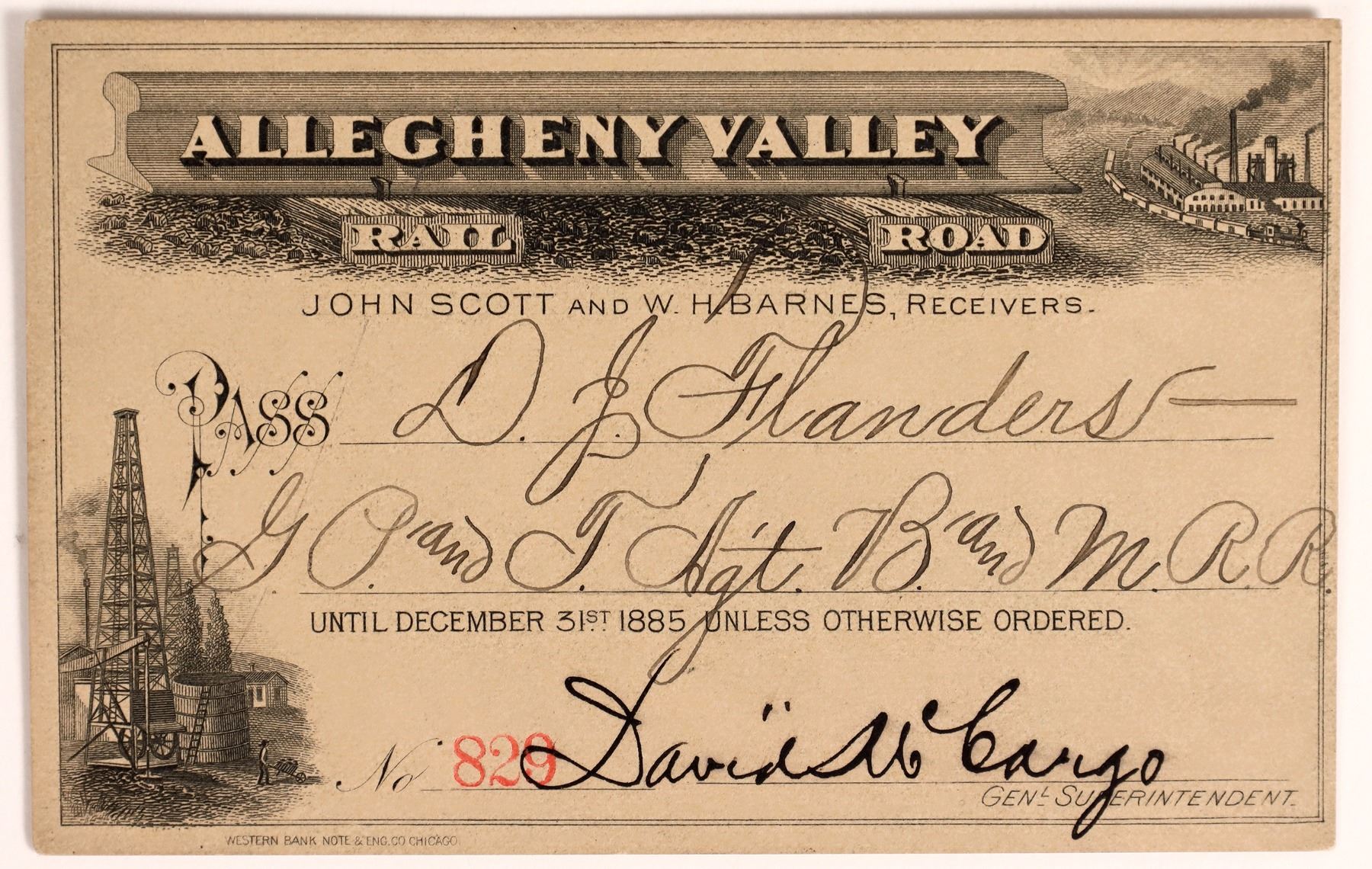 Very attractive! Pass no. 829 issued for 1885 to DJ Flanders of the B&MRR. Signed by general superintendent David Cargo. Highly pictorial pass with vignette of train near plant (upper right), oil derrick (bottom left), and railroad tie with company name (top center). Printed on cardstock by Western Bank Note Co. John Scott & WH Barnes, Receivers. Light wear. This railroad was established in the 1850s. Part of the Pennsylvania Railroad System. Followed the present company's tracks to Arnold and continued beyond, along the right upstream (southeastern) bank of the river to Oil City.