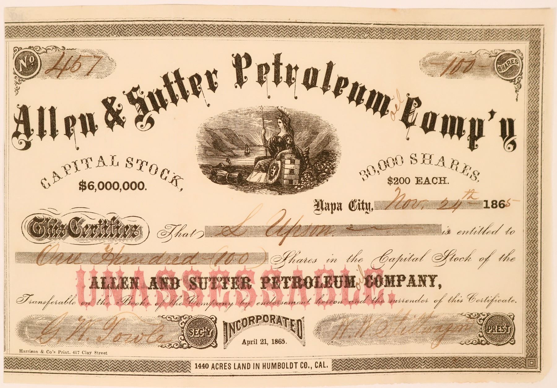 This is a simple certificate with color and history for a very short lived company. # 407 for 100 shares to L Upson on November 24, 1865. Dateline Napa City. Signed by secretary GW Towle and president WW Stillwagon. Small allegorical vignette. Red underprint "unassessable." Printed on bottom, "1440 acres of land in Humboldt Co., Cal." By 1866 work had been suspended and there was no indication when or if it might resume. "it is evident that stockholders are tired of paying assessments, while those laboring are dissatisfied with not receiving remuneration for their labor."[Mining & Scientific Press, 1866]