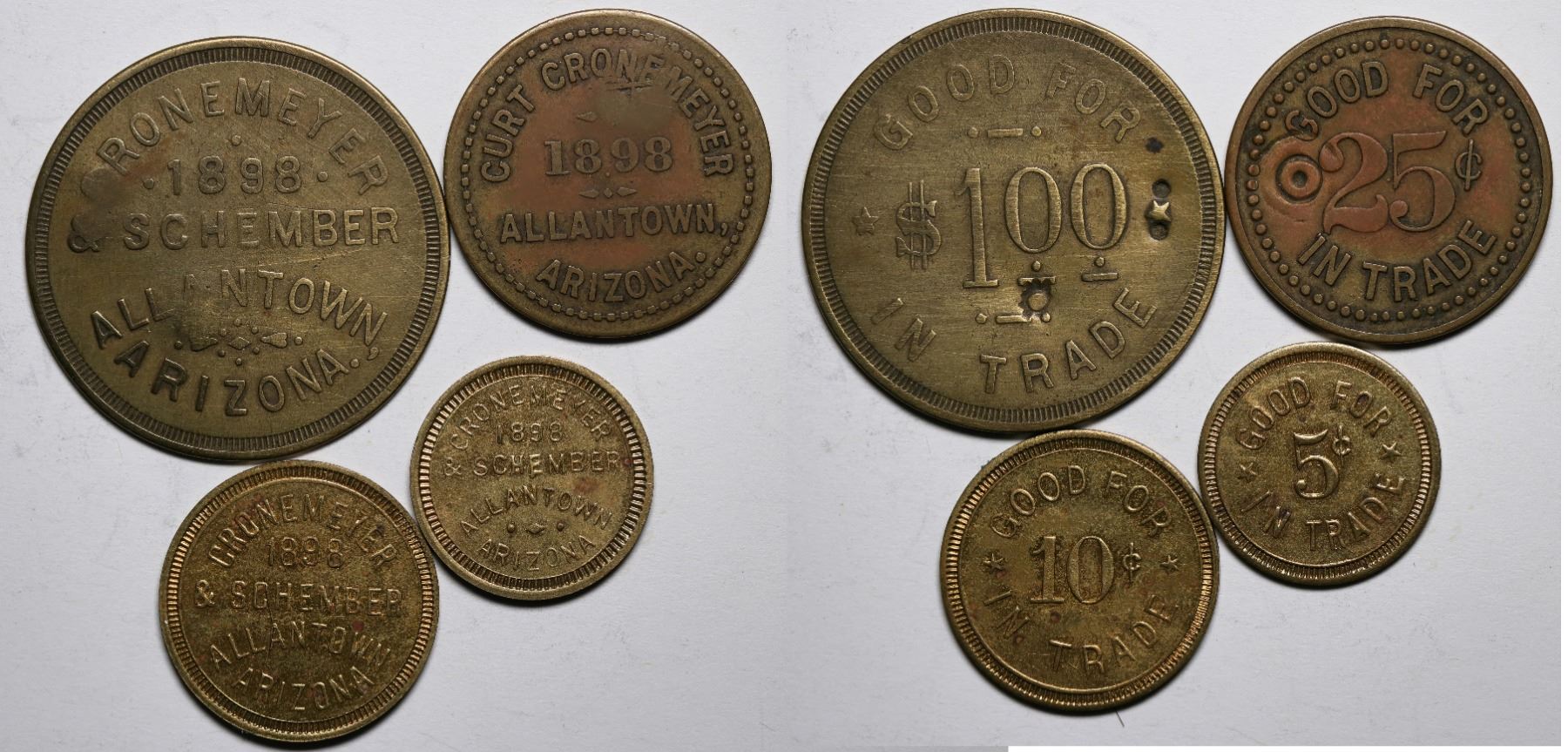 Lot of 4. 1. Cronemeyer/1898/& Schember/Allantown/Arizona//G.F./ $1.00/In Trade. Rd., Br., 33mm.