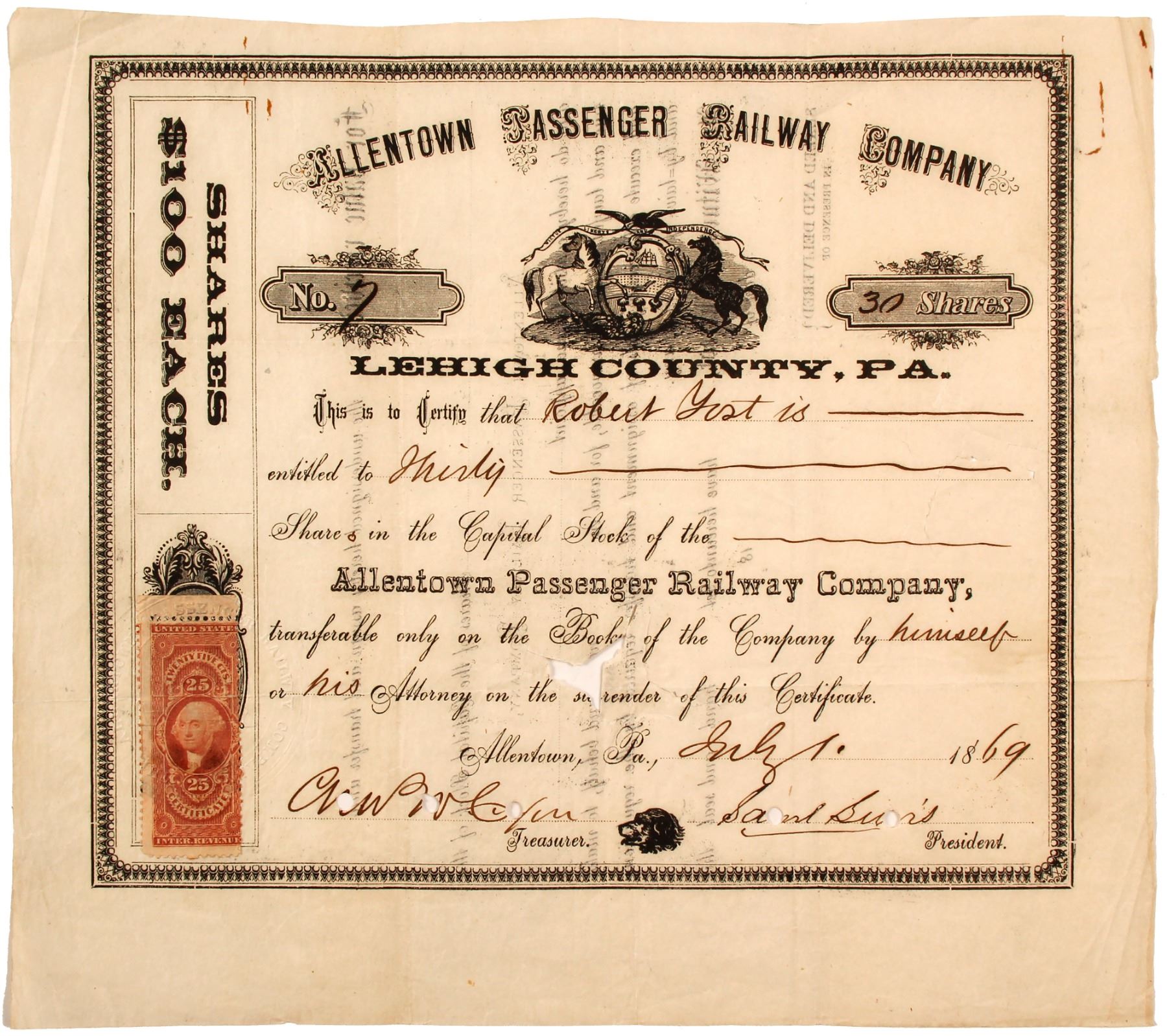 Thirty shares of cancelled Allentown Passenger Railway Company stock number 7, owned by Robert Yost with revenue stamp dated July 1, 1869. The Lehigh Valley Railroad opened its original line between Allentown and Easton, Pennsylvania in 1855. Ken Prag Collection.