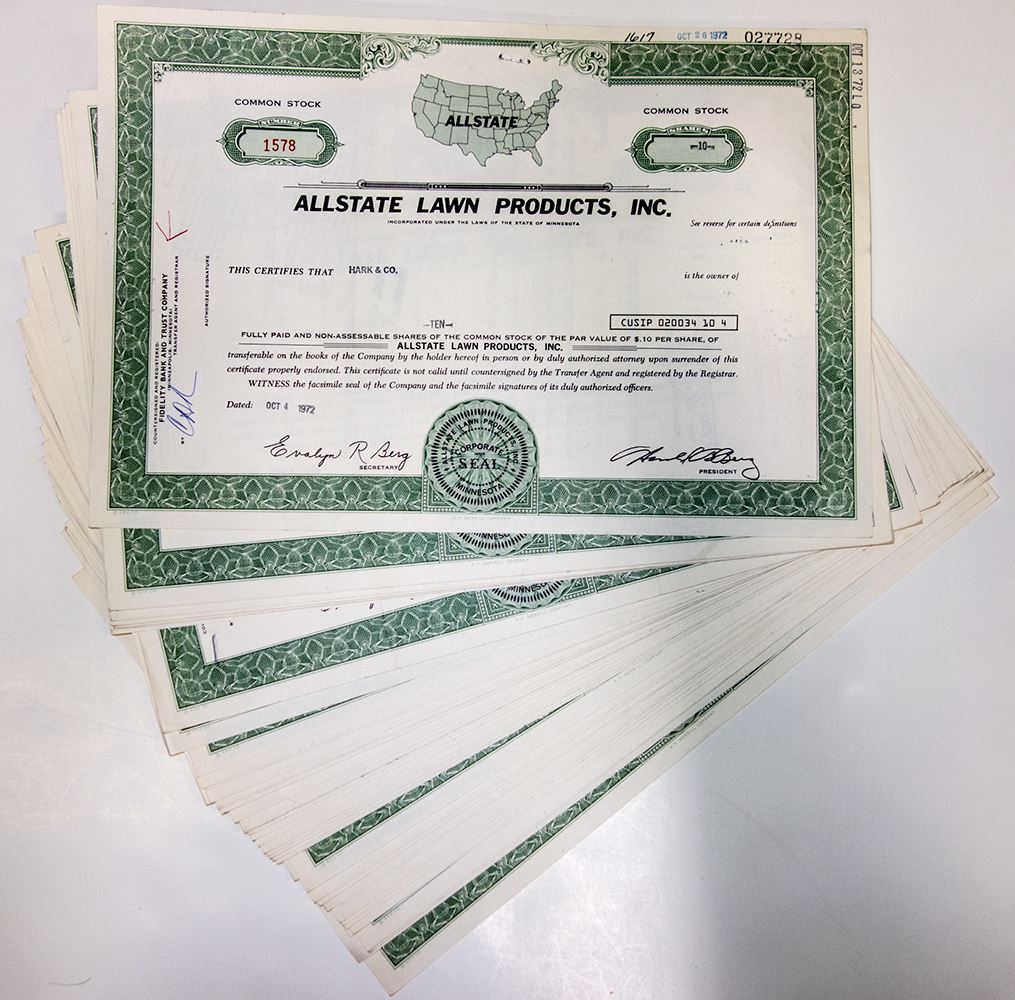 Forty eight certificates from Allstate Lawn Products issued in 1972. Vignette of a US map, with Allstate in black caps. All are punch canceled.