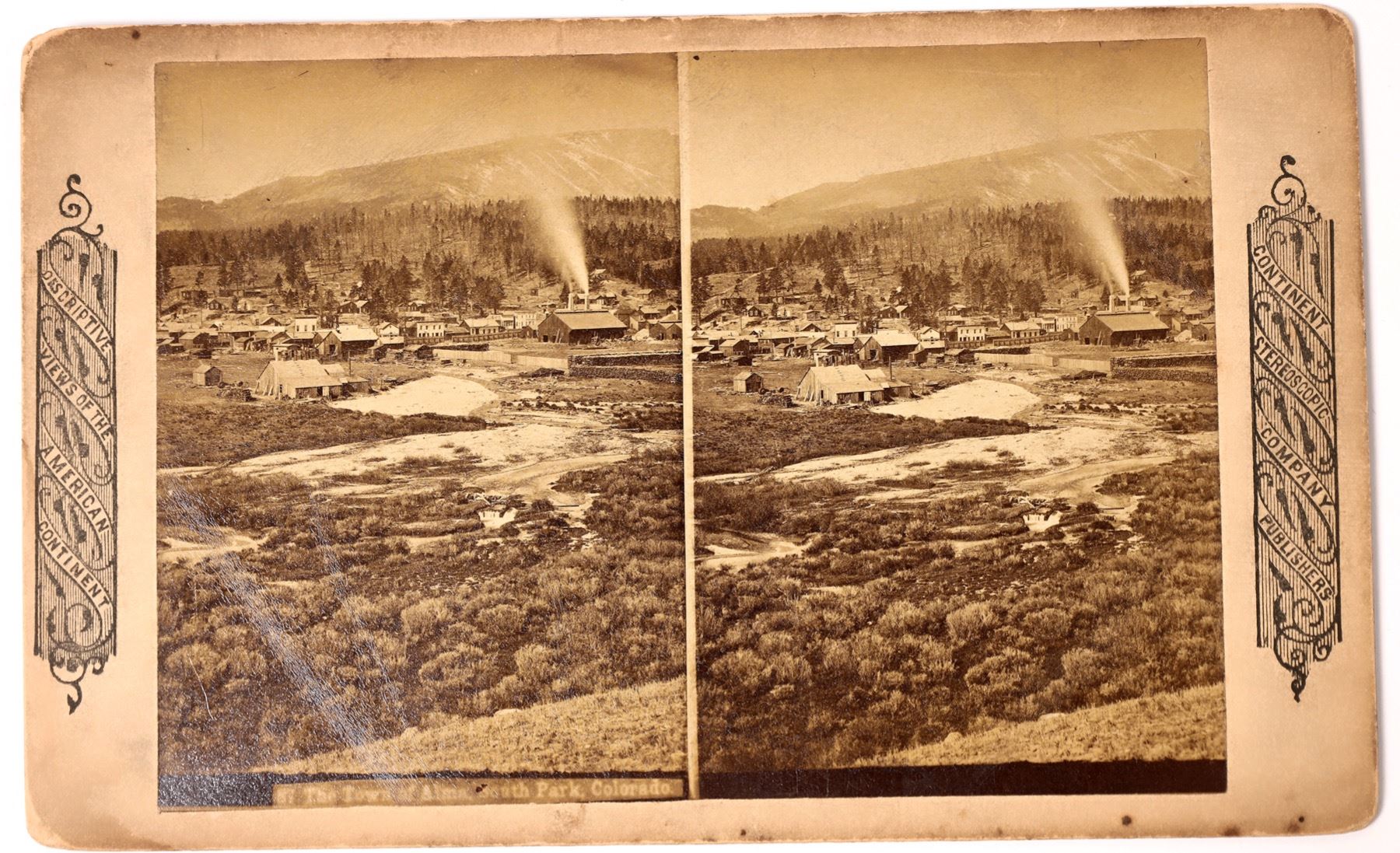 Stereoview of the town of Alma, South Park, Colorado published by the Continent Stereoscopic Company. Alma was a Colorado town that grew because of the Colorado Gold Rush. This photograph was taken from a hillside, and shows the buildings in the town with snow covered mountains in the background. Approx. 6.75 x 4.25, good condition.