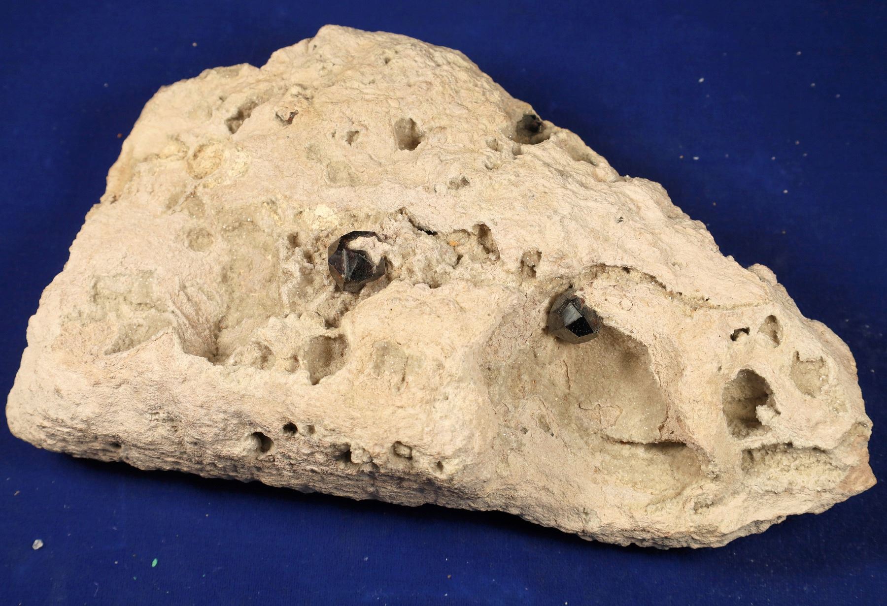 Deep reddish garnets (var. Almandine based on published Fe:Mn ratios in the range of 2.5:1) in flow-banded rhyolite matrix, likely to be from the Robinson Mining District between the towns of Ruth and Ely, Nevada. Approx. 9 x 5.5 x 2 inches. Garnets in the photo are about 1/2-inch in diameter. Today you can visit a public quarry on Garnet Hill in the Garnet Fields Recreational Area which is just across US Highway 50 (The Loneliest Road in America) from the Robinson Open-Pit Copper Mine and collect your own specimens. If you don't want to drive that far, bid on this specimen.