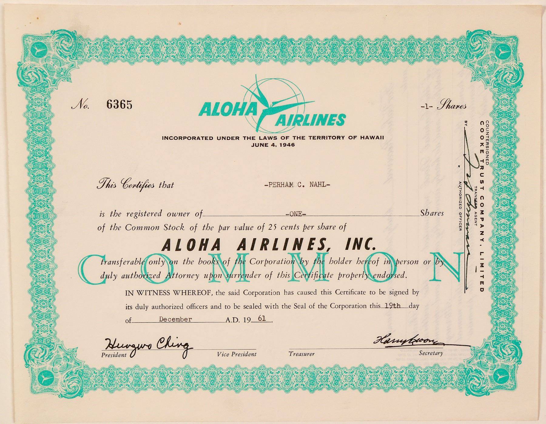 Inc. in the Territory of Hawaii in 1946. No. 6365, issued for 1 shares to Perham C. Nahl on Dec. 19th, 1961. Signed by president Ching and the secretary. Not cancelled. Blue/green border, black print, and fancy company logo. Staple holes, folds. 8.5 x 10.5" Operations began on July 26, 1946, and ceased on March 31, 2008. The airline was founded as charter carrier Trans-Pacific Airlines by publisher Ruddy F. Tongg, Sr. as a competitor to Hawaiian Airlines, commencing operations on July 26, 1946, with a single World War II-surplus Douglas C-47 (DC-3) on a flight from Honolulu to Maui and Hilo. Ken Prag Collection