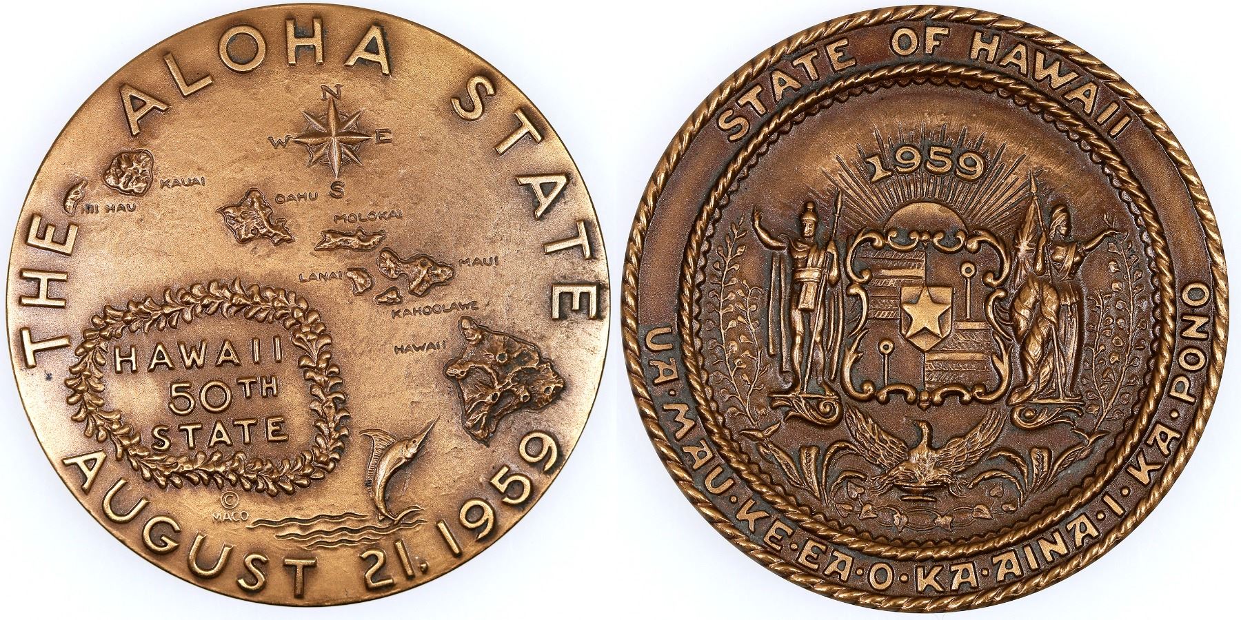 Bronze example of the medal created by Medallic Art Co. of New York to celebrate Hawaiian statehood, August 21, 1959. 63 mm, 129 grams. California sculptor Spero Anargyos (1915-2004) was commissioned to design and model the Hawaii Statehood Medal, Medallic Art Company catalog number 1959-092. More than fifty gold medals were made. Three thousand serially numbered silver were issued, in addition to 29,599 unnumbered bronze. All medals were 2 1/2-inch (63mm) diameter.
