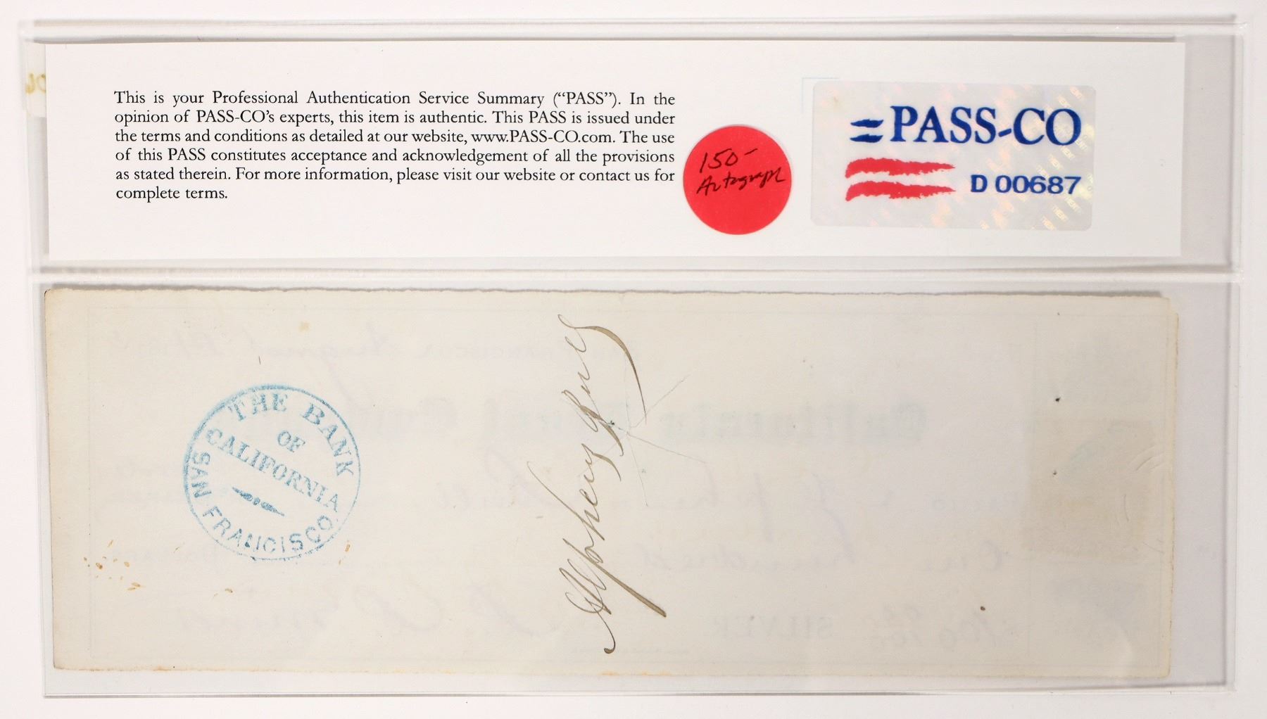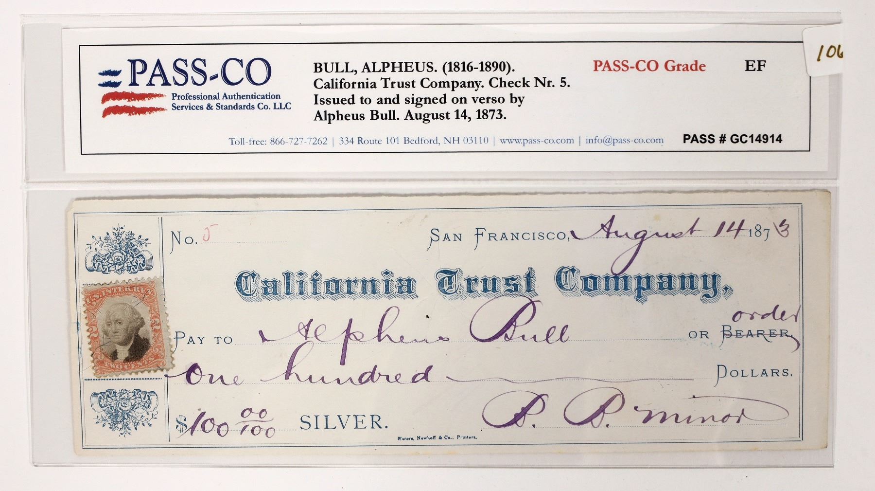 Check written to and signed on reverse by Alpheus Bull, a Comstock millionaire. Bull was on the Board of many important Comstock mining companies, especially the Gould & Curry in 1863 when the company built the largest ore mill in America. In PASCO holder.