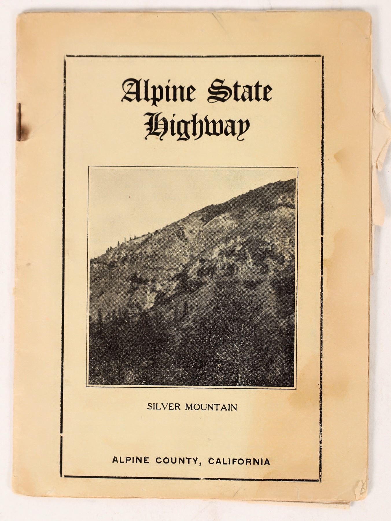 Very rare Alpine State Highway booklet, 14pp with foldout 12x8.5" map with crease tears. Photo of Silver Mt. on cover. Verso and small map water stain. Alpine County California