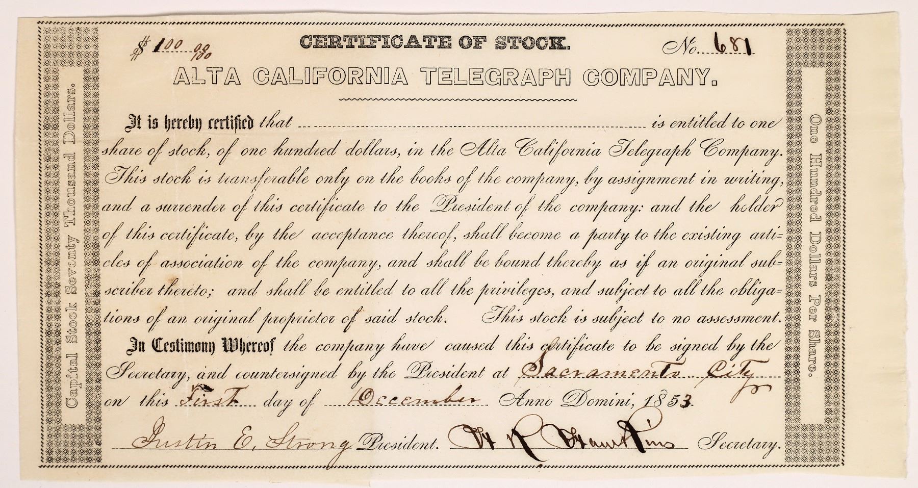 Very rare! Pre-Transcontinental Telegraph! Gold Rush era. Certificate No. 681, issued for one shares to (blank) on December 1st, 1853 in Sacramento City. Signed by president Justin E. Strong and secretary Hawkins. Not cancelled. Black border and print. No printer listed. 5 x 13" The company completed a line from Sacramento to Nevada City with subsequent connections to mining camps. Eventually, they headed towards the Bay Area which put them into direct competition with California State Telegraph Co. When Alta laid a line down from Oakland to San Francisco (through the San Francisco Bay), they were sued by California State Telegraph and lost. Eventually, they consolidated.