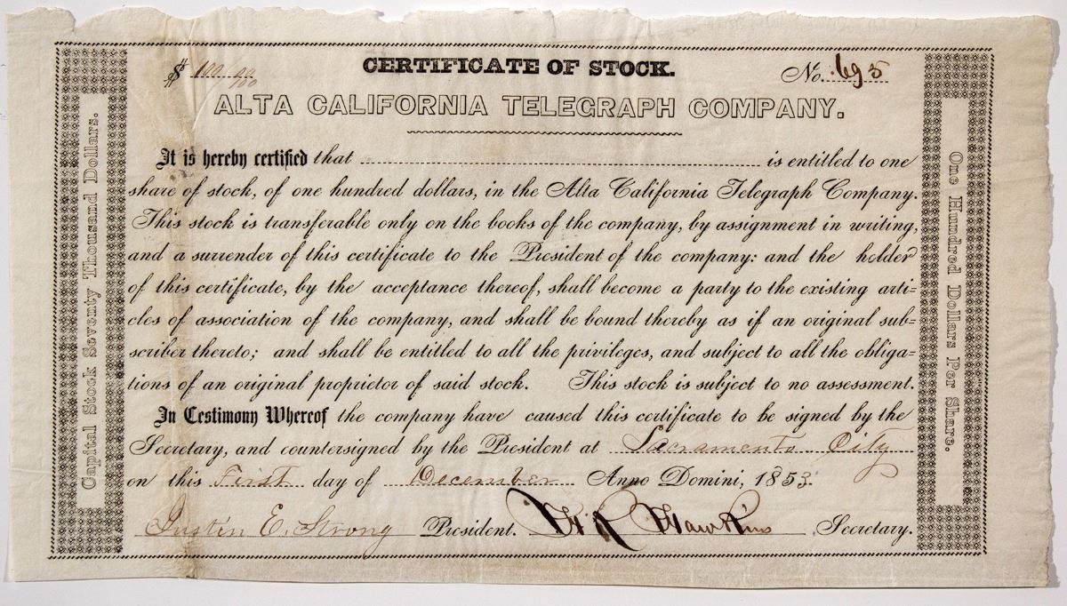 Very rare! Pre-Transcontinental Telegraph! Certificate No. 695. Signed by Justin E. Strong (the company president) and secretary. Not issued to anyone, though the certificate is dated Dec. 1st, 1853 in Sacramento City. No vignette. 9.5" x 5.25" Deep crease and fold along left side. Rough top edge. Delicate paper. The company completed a line from Sacramento to Nevada City with subsequent connections to mining camps. Eventually, they headed towards the Bay Area which put them into direct competition with California State Telegraph Co. When Alta laid a line down from Oakland to San Francisco (through the San Francisco Bay), they were sued by California State Telegraph and lost. Eventually, they consolidated. (Prag Collection)