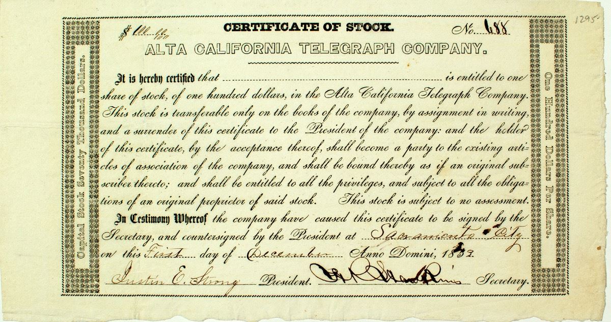 Gold Rush stock certificate, extremely rare. The first California telegraph, certificate number 688, for $100.00, signed by company President Justin E. Strong, on December 1, 1859. Printed on "onionskin" paper, it is in excellent condition. The Alta telegraph Company was started in 1854, and was ultimately incorporated into the national Western Union Company. (Prag Collection) City: Alta State: California Date: 1859 hwac# 28942