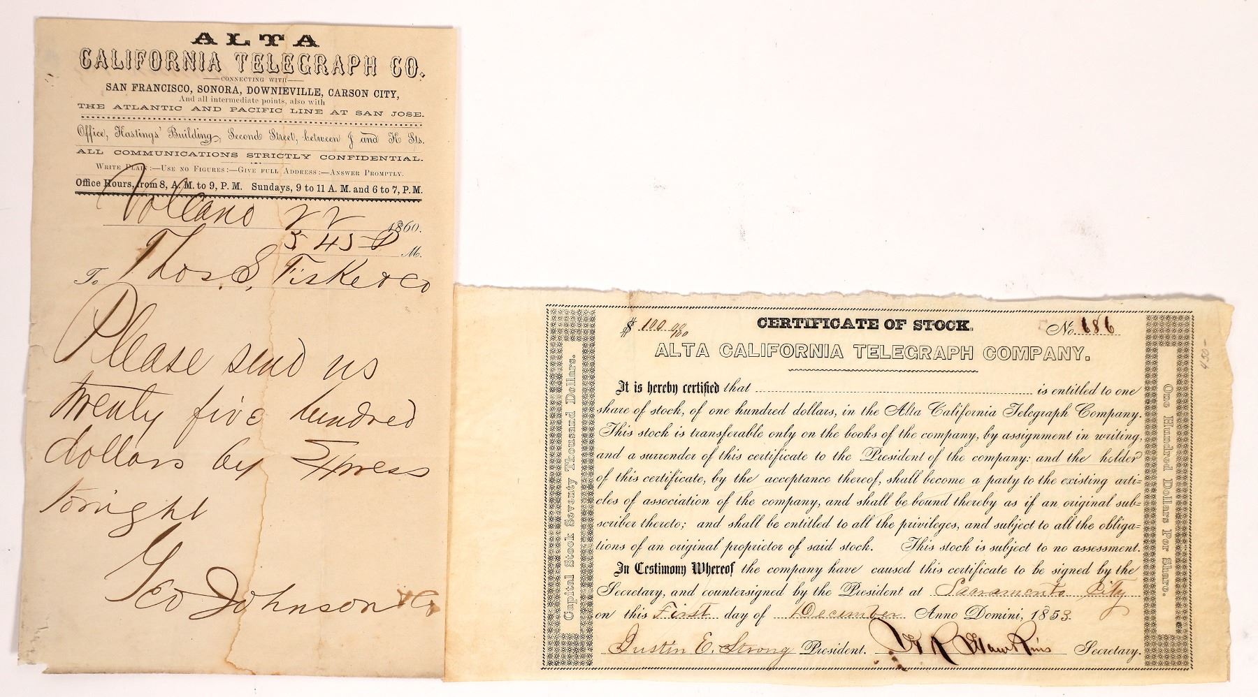 Lot of 2. 1) Very rare stock! Pre-Transcontinental Telegraph! Gold Rush era. Certificate No. 686, issued for one shares to (blank) on December 1st, 1853 in Sacramento City. Signed by president Justin E. Strong and secretary Hawkins. Not cancelled. Black border and print. No printer listed. 5 x 13" 2) Telegram dated Volcano, 1860. Message sent from Geo. Johnson & Co. to Thos. Fiske & Co. (Bankers in Sacramento) requesting $2,500 to be sent by express! (These would be gold coins). The top of the form says the company connects "San Francisco, Sonora, Downieville, Carson City..." Volcano is located in Amador County. This rare telegraph form does have staining._x000D_