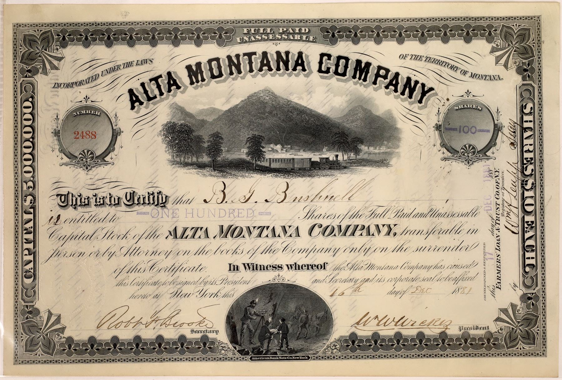 Inc. in the Territory of Montana. No. 2488, issued for 100 shares to B.G. Bushnell in 1881 in New York. Signed by president WW Wickes (namesake of Wickes, Montana) and secretary Robt. Brooks. Not cancelled. Gorgeous design with black border and print, and two vignettes: train with city and mines in the background on a mountain (top center) and miners working underground (bottom center). Printed by ABN. Pinholes, very clean. 7 x 10.5" This mine is one of the oldest in Montana. The Alta was discovered in 1869. Walter Wickes (president of this company) and other New York capitalists arrived in the late 1870s, took over the Alta, and platted out the camp of Wickes. In 1880, the company reorganized. They owned the Alta, David Copperfield, and Rocky Bar lodes. [See a detailed report in the Jan. 1st, 1880 Helena Weekly Herald] The mill of the Alta was burned down in 1882, and Sam Houser stepped in and rebuilt it. The Alta Mine stopped operating in the 1890s. Wickes nearly burned down in 1901 and 1902.