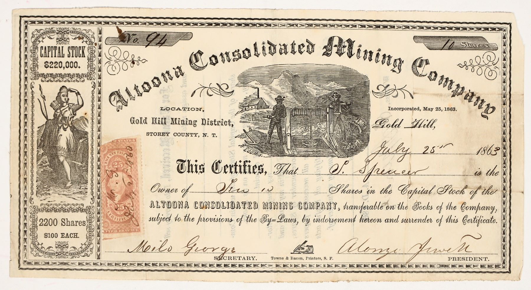 "Location, Gold Hill Mining District, Storey County, N.T." printed to the left of rare mine winze vignette by Loomis. Inc. May 1863. No. 94, issued for 10 shares to T. Spencer in Gold Hill in July 1863. Signed by president A. Jewett and secretary Miles George. Not cancelled. Black border and print with allegorical and mining vignettes. Towne & Bacon printers. 25 cent revenue stamp at left. Folds and creases, one corner clipped, some smudges. Jewett is listed as a broker and mining secretary in the Collins 1864 directory. George and Spencer are not listed.