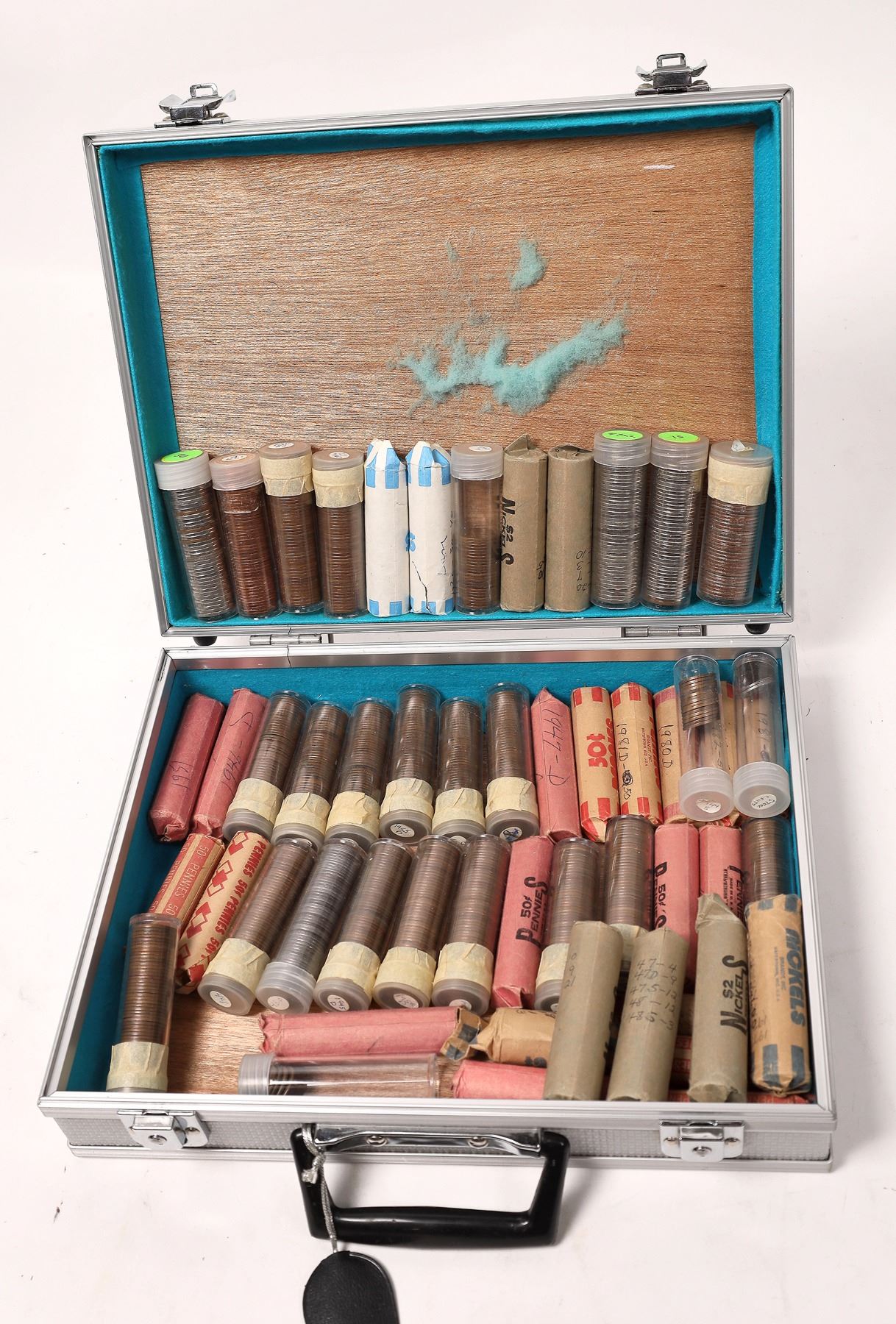 Locking aluminum case including keys filled with rolls of coins. Case is 12 x 10 and 3 inches tall. Coins are Lincoln pennies, marked 1940, 1941-D, 1943 (steel), 1944, 1945, 1945-D (2), 1946-D (2), 1947-D, 1949, 1951, 1951-D, 1952-D, 1955-D (3), 1956-D (2), 1958-D, 1974-D (BU), 1980-D, 1981 (2), 1981-D. 1982, 1999-D, 2000-D. Eight partial rolls and mixed dates. Six rolls of Jefferson nickels; five rolls of Canadian nickels (some BU); two rolls of Canadian pennies; one roll of 1975 Bicentennial Washington Quarters.