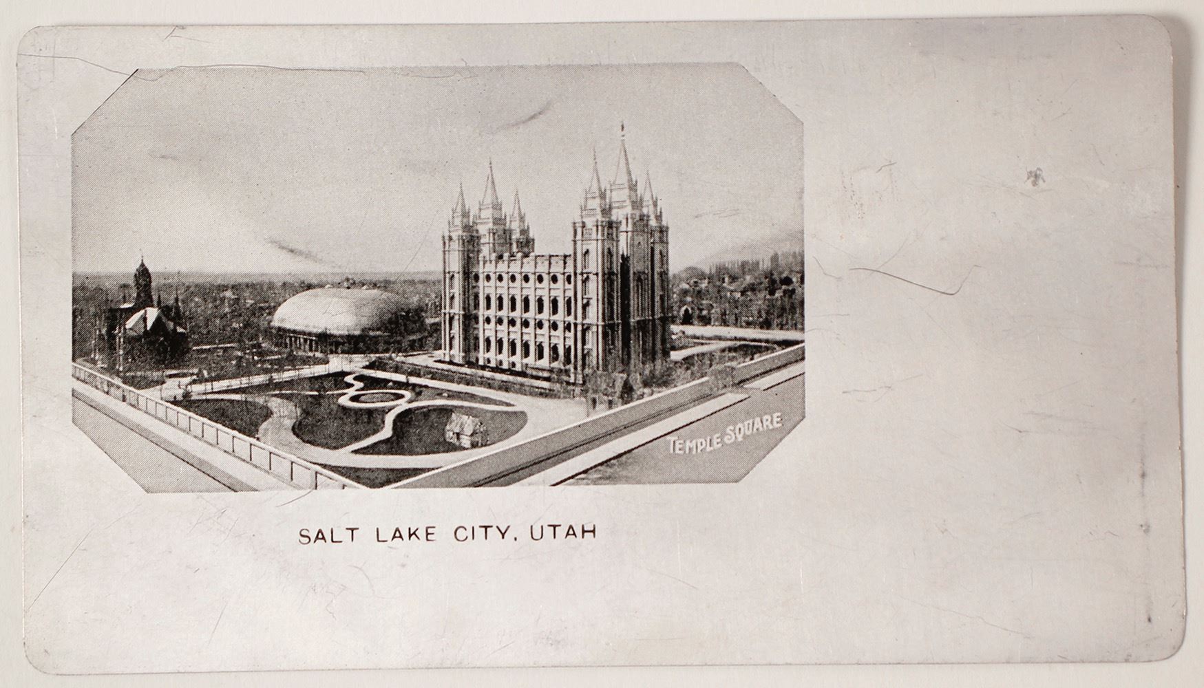 Rare. Only one in the hundreds we sorted from this collection. Unused aluminum postcard showing the Mormon Temple in Salt Lake City. Published by New Jersey Aluminum Company. Some dents. 3 x 5.25" (Prag Collection) Date: Location: Salt Lake City, Utah HWAC# 55443