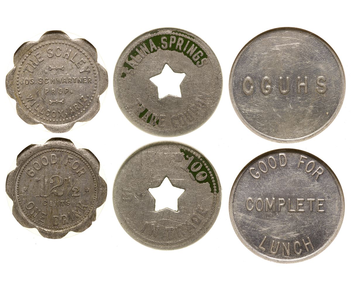 Lot of 3: 1) Obv.: The Schley / U.S. Sohwartner / Prop. / Willcox, Ariz.; rev. Good For / 12 1/2 / cents / One Drink. Scalloped, NGC MS61; 2)Obv. CGUHS; rev.: Good For / Complete /Lunch; Casa Grande; 3) Obv.: Salina Springs / Trade Coupon; rev.: Good For $1.00 / In Trade.