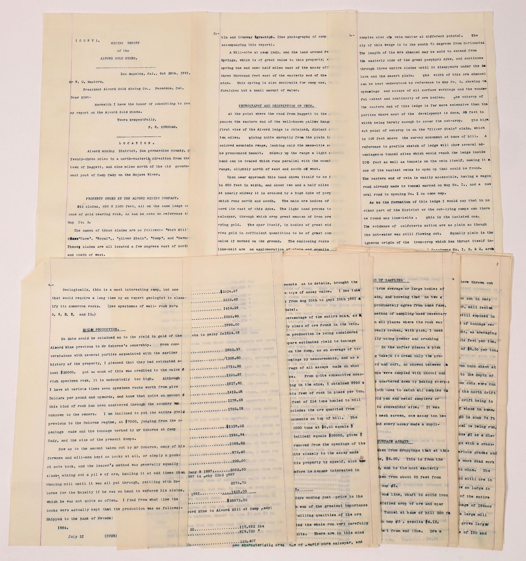 1891 mining report from Alvord Gold Mines in San Bernardino County, CA. 6 claims of gold bearing rock, discussion of ore, yields and drills.