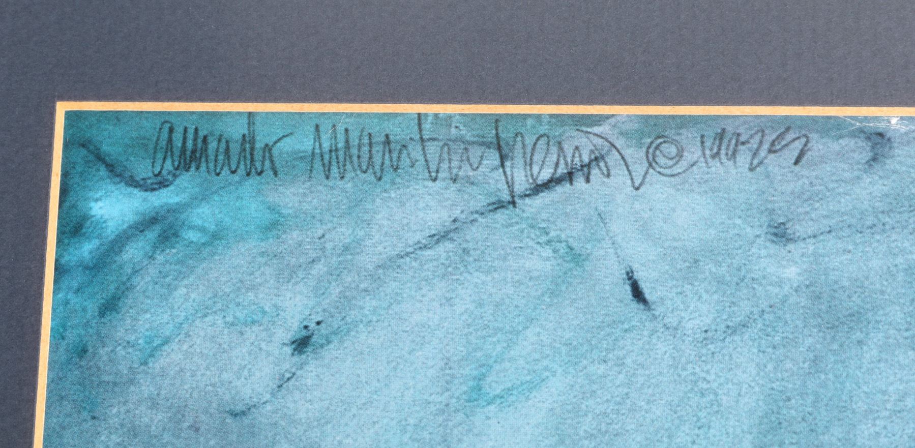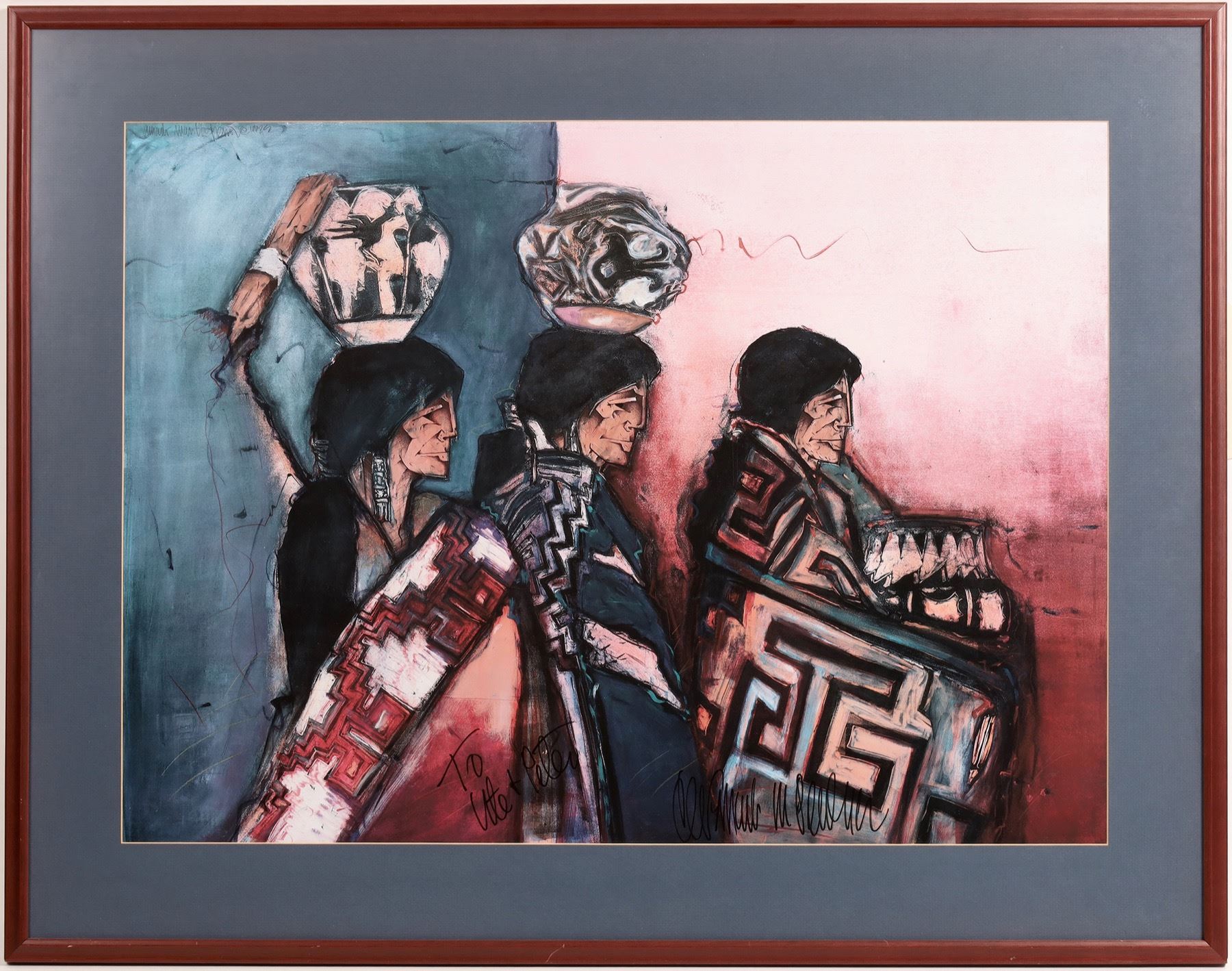 "Image of three Native Americans, Two with pots on their heads, all wrapped in woven blankets. Hand signed ""To Ute and Peter"", by Amado Maurilio Pena. Beautifully colored in reds and blues. Image--22"" x 30"", matted and framed--29.5"" x 37".