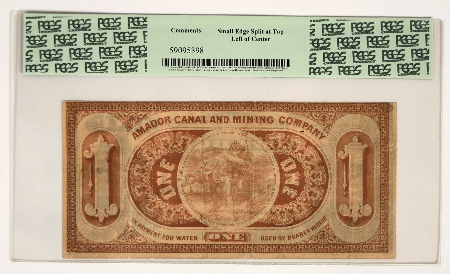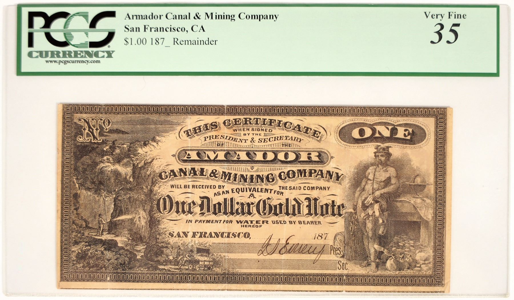 We had a $5 note in our Gold Rush sale in 2018: this is an unissued remainder $1 note, graded Very Fine 35 by PCGS: (small edge split at top left of center). An extremely rare California scrip item which is as close to a true obsolete note as exists from California. This note is payable for water used by the bearer and is "an equivalent for a One Dollar Gold Note," a clear reference to the then current National Gold Bank. Signed by the President J. S. Emery. Vignette at left shows a miner operating a water cannon in a hydraulic mining scene with two miners working below near a tunnel. On the right is a vignette of Mercury standing with an open safe with piles and sacks of coins and ingots. The back is in ornate gold-orange color and features a portrait of Neptune. Printed by Britton, Rey of San Francisco. Extremely rare. Approx. 3 x 6 1/2 inches.