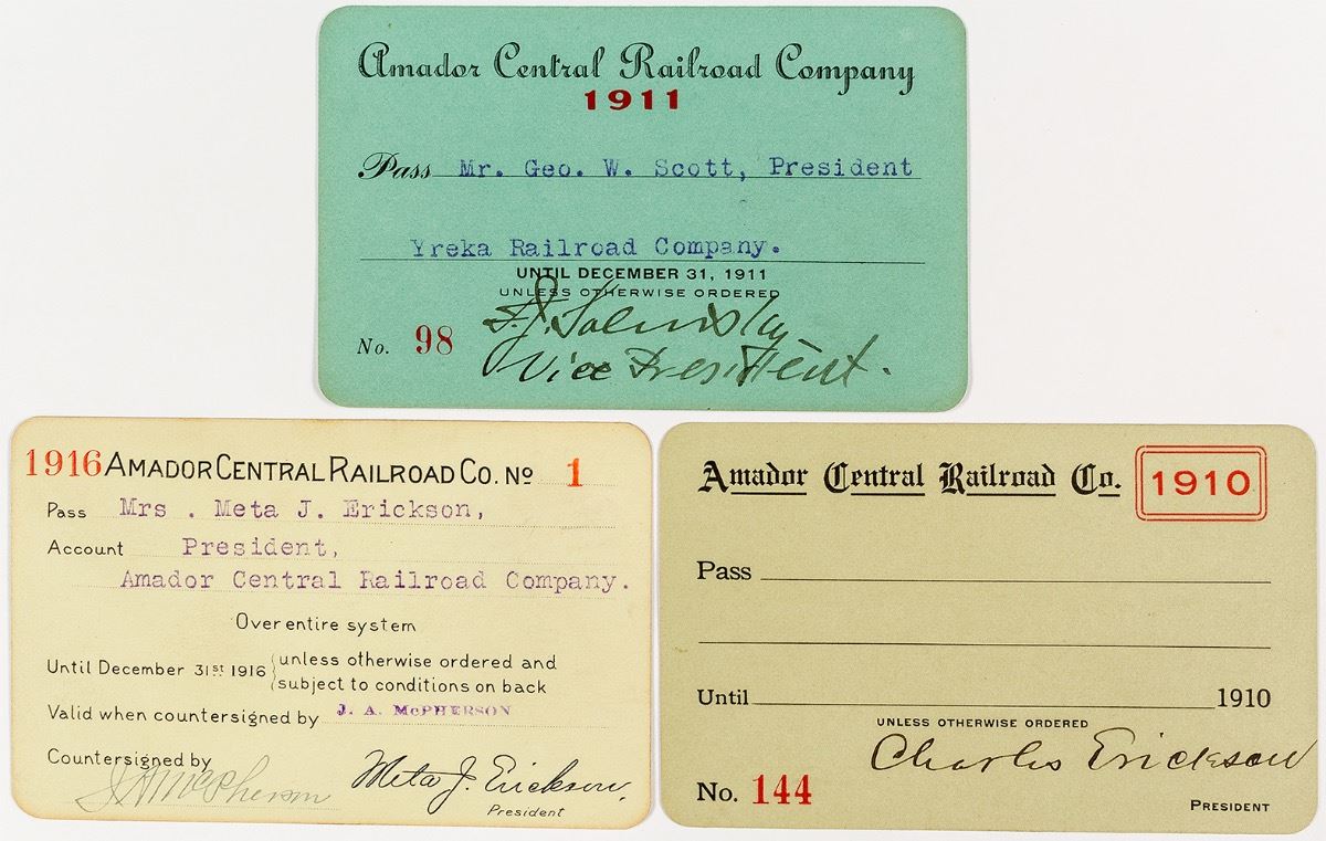 Three different passes: 1910, unissued but signed by Charles Erickson as president; 1911, issued to Geo. W. Scott, president of the Yreka Railroad; and 1916, pass no. 1! Issued to Mrs. Meta J. Erickson, president of the railroad! All printed on cardstock. This standard gauge rail served as a connection between Ione and Martell beginning in 1904. (Prag Collection) City: Ione State: California, Date: Inventory# 39233