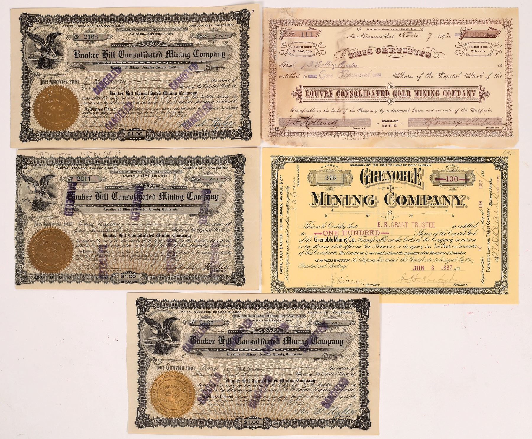 Lot of 5. 1) Grenoble Mining Company. Inc. in CA. No. 376, issued for 100 shares to secretary ER Grant in 1887. Also signed by the vice president. Not cancelled. Black print on yellow paper. Pinhole, clean. 2) Louvre Consolidated Gold Mining Company. "Location of Works, Amador County, Cal." (printed at top center). No. 111, issued for 1,000 shares in 1892 to secretary JF Holling. Also signed by the president. Not cancelled. Staining, folds. 3) Bunker Hill Consolidated Mining Company. "Location of Mines: Amador County, California" (printed under title). Three stocks issued in 1921, stamp cancelled.