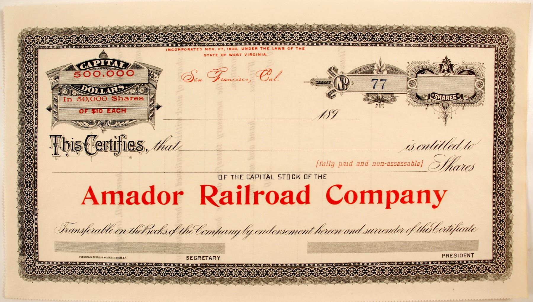 Non-issued certificate #77 for 50,000 shares of Capital stock. San Francisco, CA. Rare. Unlisted in Cox. Amador Railroad incorporated in 1893 in West Virginia. Ken Prag Collection