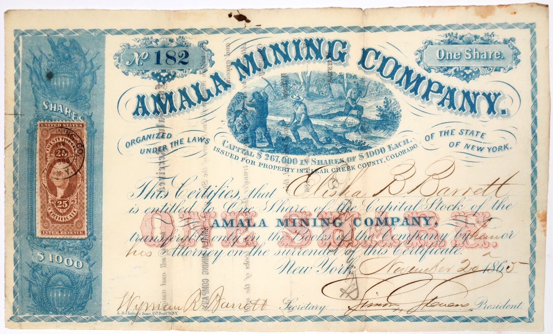 Early Colorado mining certificate! "Issued for property in Clear Creek County, Colorado" (printed under vignette). Inc. in New York. Certificate number 182, issued on November 20, 1865 at New York, to Elisha B Barrett. Signed by president Simon Stevens and secretary Wyman R Barrett. Not cancelled. Printed by EB Carlton & Sons. Blue font, vignette of miners working in a stream. Red underprint "ONE SHARE." 25c Revenue stamp. 5.5 x 9.5" Folds with minor separation, creases, some discoloration. Not listed in Hollister.