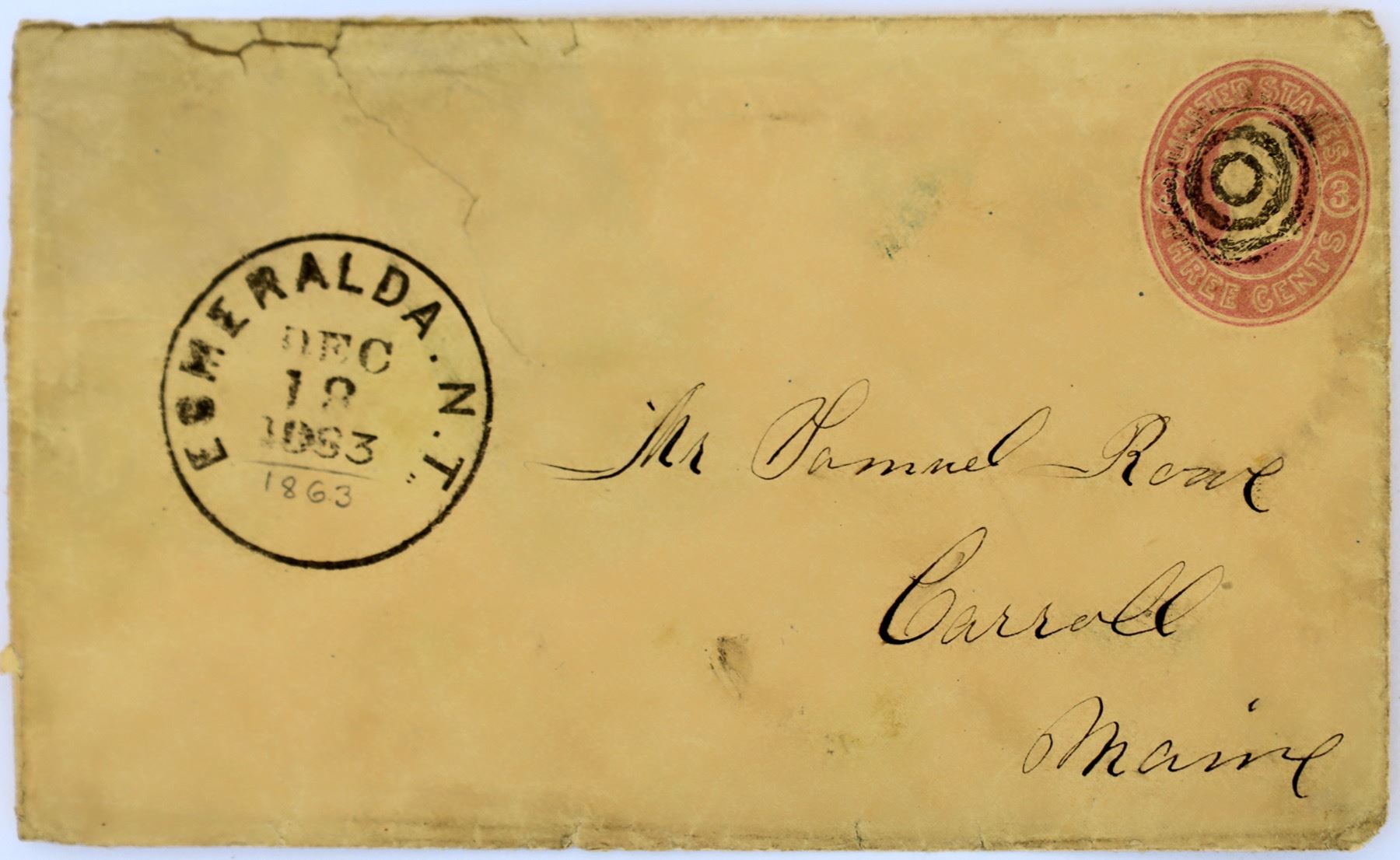 Rarity-6. 1863. Includes history on the Territorial debate where the capital should be located: Carson City, Virginia City, Dayton, or Aurora (Esmeralda) Large circle with targe killer. Year is stamped 1063. 1863 is written in below it.