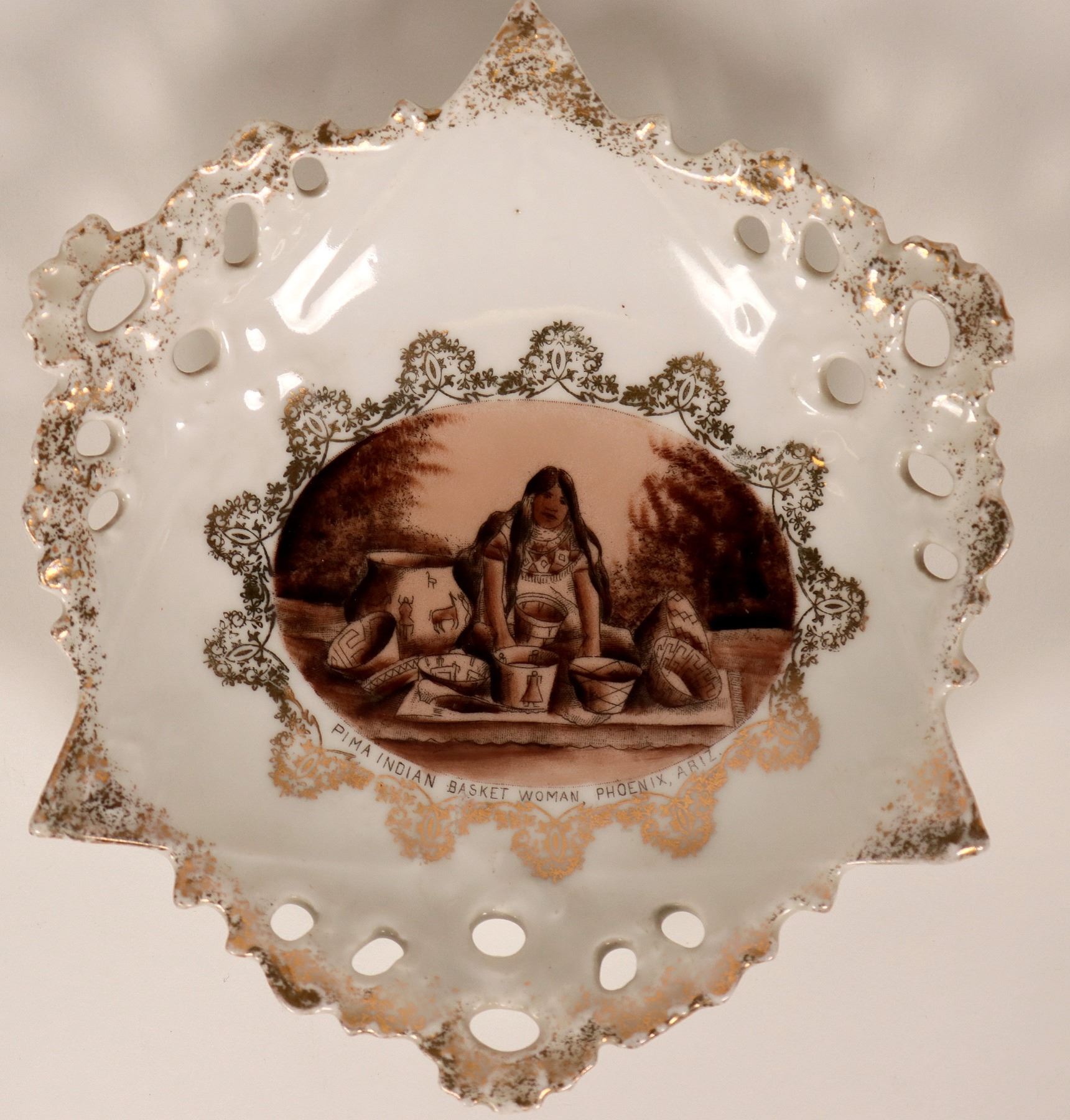 "Pima Indian Basket Woman", Phoenix, Ariz. This dish was made in Austria for C. H. Davidson & Co. Wheelock China, white with sepia toned image and gold splash rim. Very good condition.