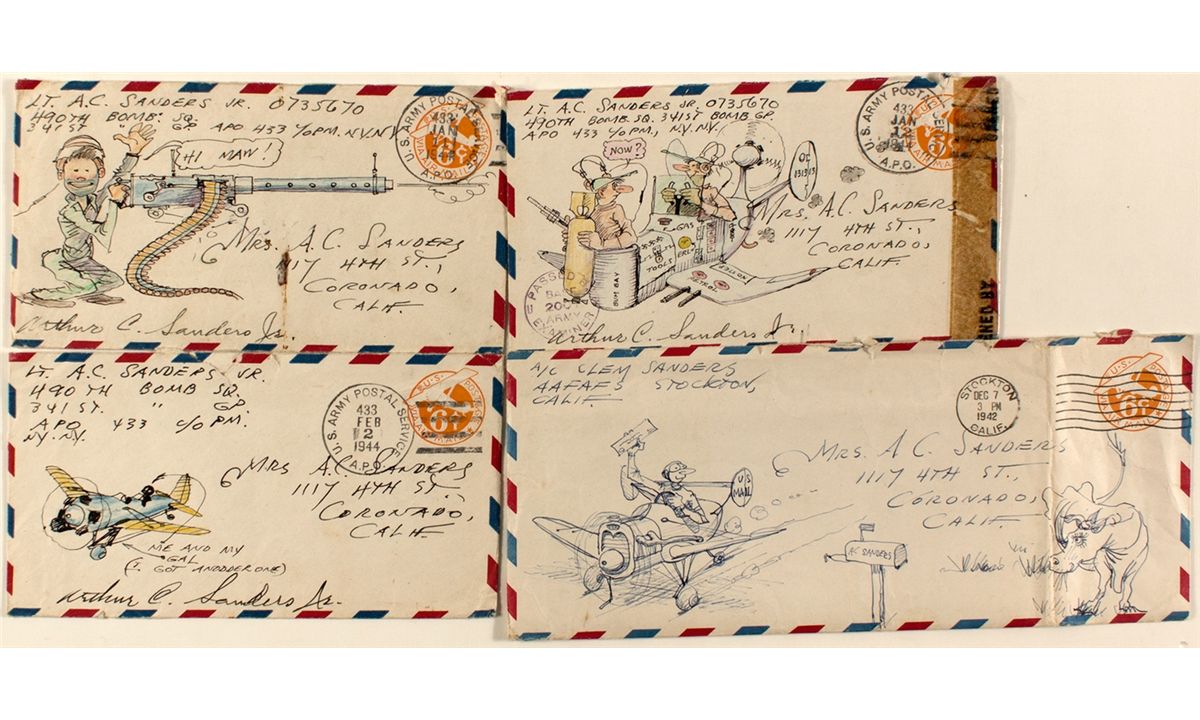 This is a story of a bomber pilot and a budding artist whose life ended all too short. On March 17, 1944, Lt. Arthur 'Clem' Sanders took his plane off from Kurmitola Airfield in India on a low level mission over Shweli Bridge in Burma (part of the Burma Bridge Busters). After successfully bombing the bridge, the formation made a turn to the right to strafe anti-aircraft gun positions. Sanders B-25 was observed flying parallel to the river and over the bridge. Three shell bursts were observed behind it and one burst below the left left wing, causing it to roll, stall, then spin and crash into the river and explode. All aboard were lost. One envelope cover was drawn while he was stationed in Stockton. The last three were drawn a few months before his untimely death. One letter about his experiences flying in training. (Burger collection)