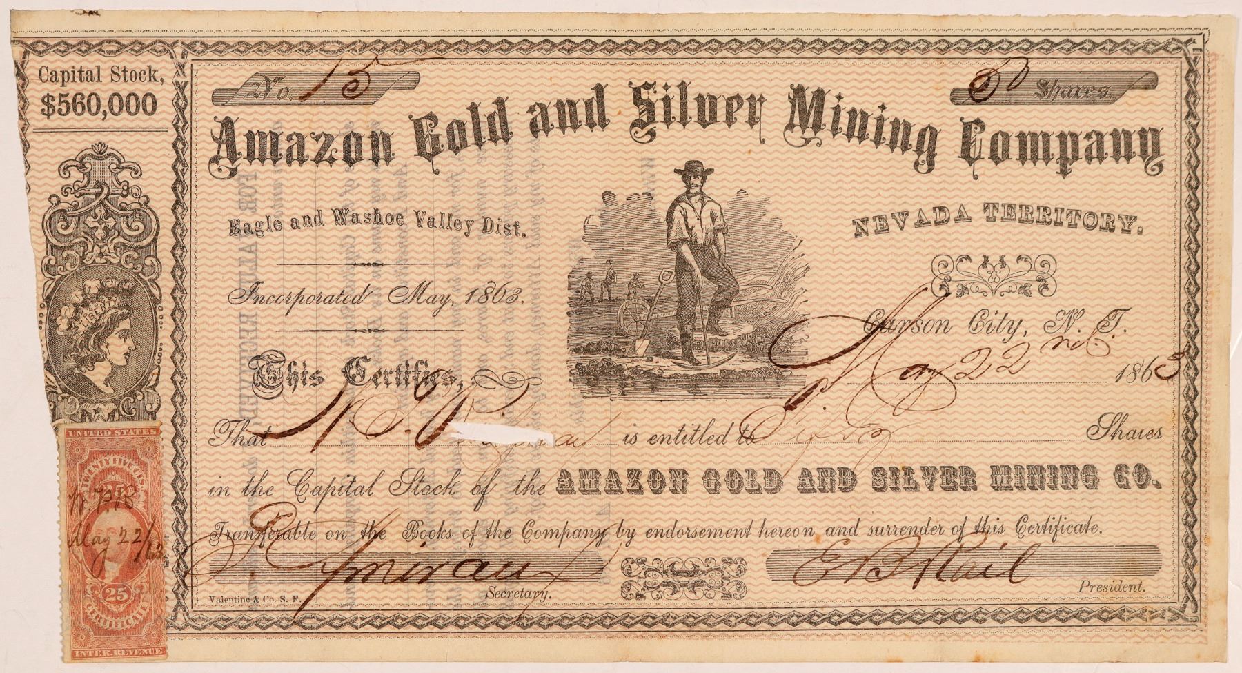 I/U/#15 issued to (illegible), 50 shares. Signed stock by President E.B. Rail. He also worked for Carson City Mint. Eagle & Washoe Valley District, possibly the gold in the Little Valley. Has revenue stamp & is cut tight at the left.