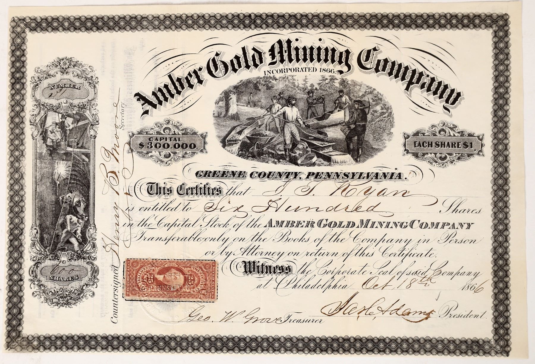 No 31 for 600 shares to J. F. Ryan signed by Geo W Grove as treasurer, and Adams as president. Dated Oct 18, 1866. Amber, a gem stone, is the Polish "gold," where it is exceptionally highly valued. Anyone who has been to Gdansk knows what I am talking about. Here is a certificate with two forms of gold!