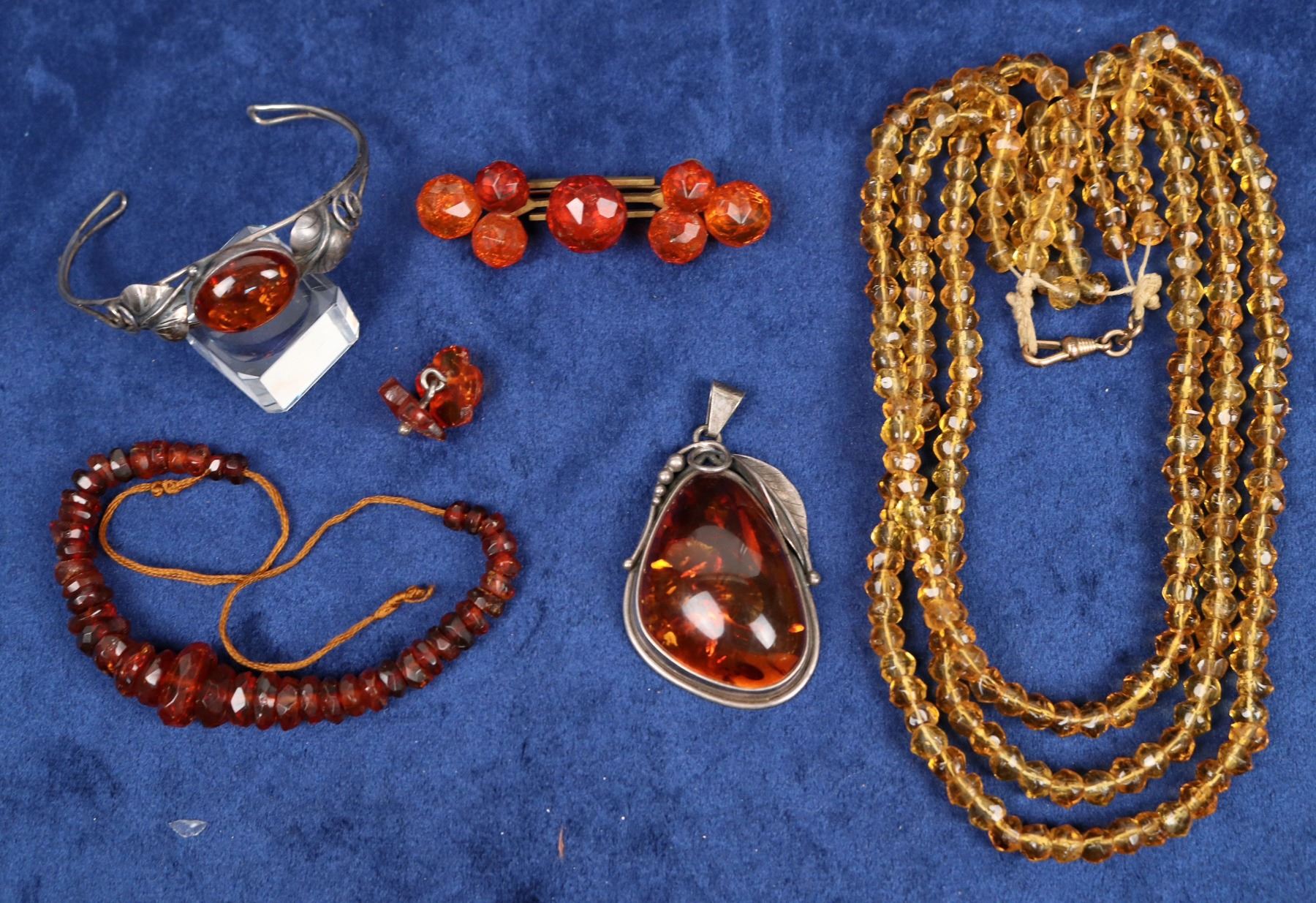 Real amber pendant mounted in silver. Real amber and silver bracelet. Faux amber graduated cut beads--bracelet or necklace needs restringing. Faux amber 3-strand necklace (needs restringing--shortest strand--15". Also faux amber brooch and button.
