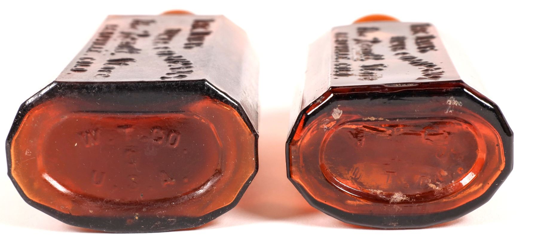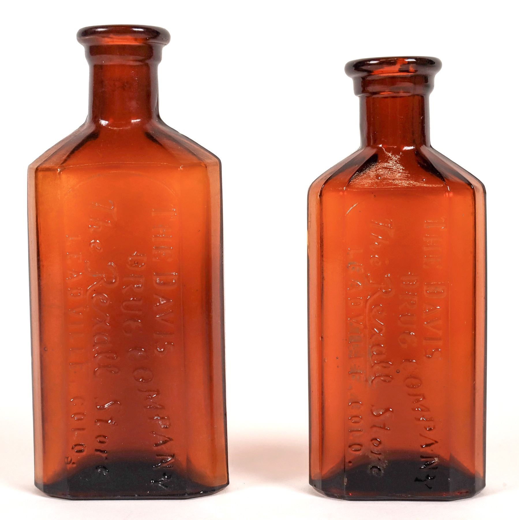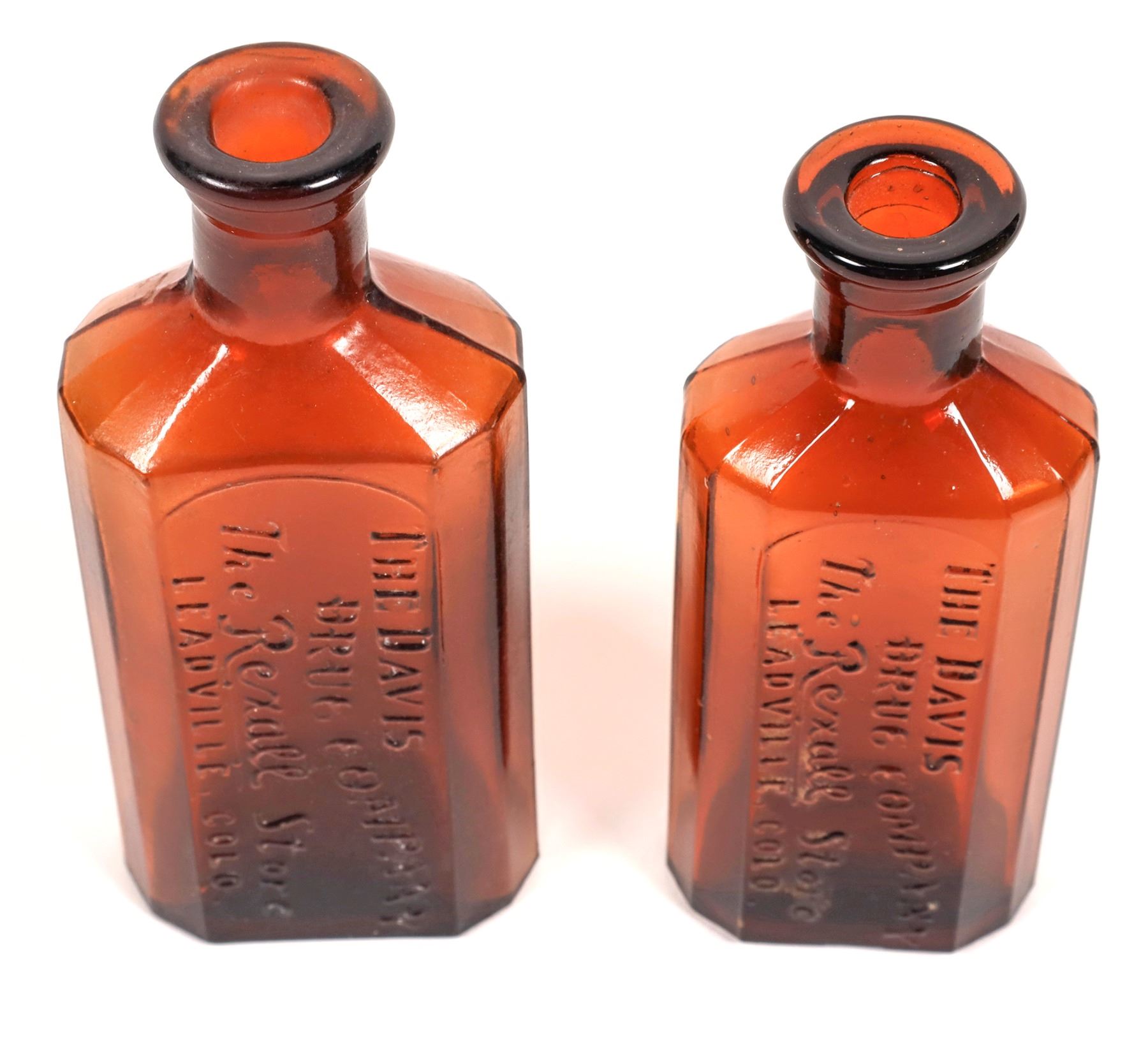 Two amber drug bottles from Leadville. The Davis Drug Co., The Rexall Store, Leadville, Colo., 5 1/4, 4 7/8" tall. Both sparkling clean, no chips. c1900 (no ounce designation), 14 sided, 13 thin tall panels all around plus the embossed face.