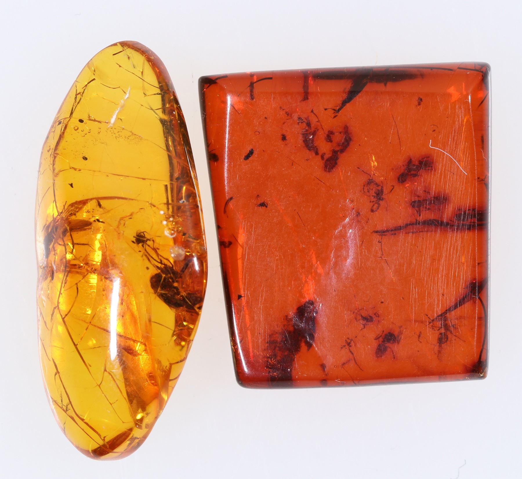 Two pieces of amber with insects trapped inside. Orange (24 x 10 mm) and red (17 x 19 mm). Choice pieces.