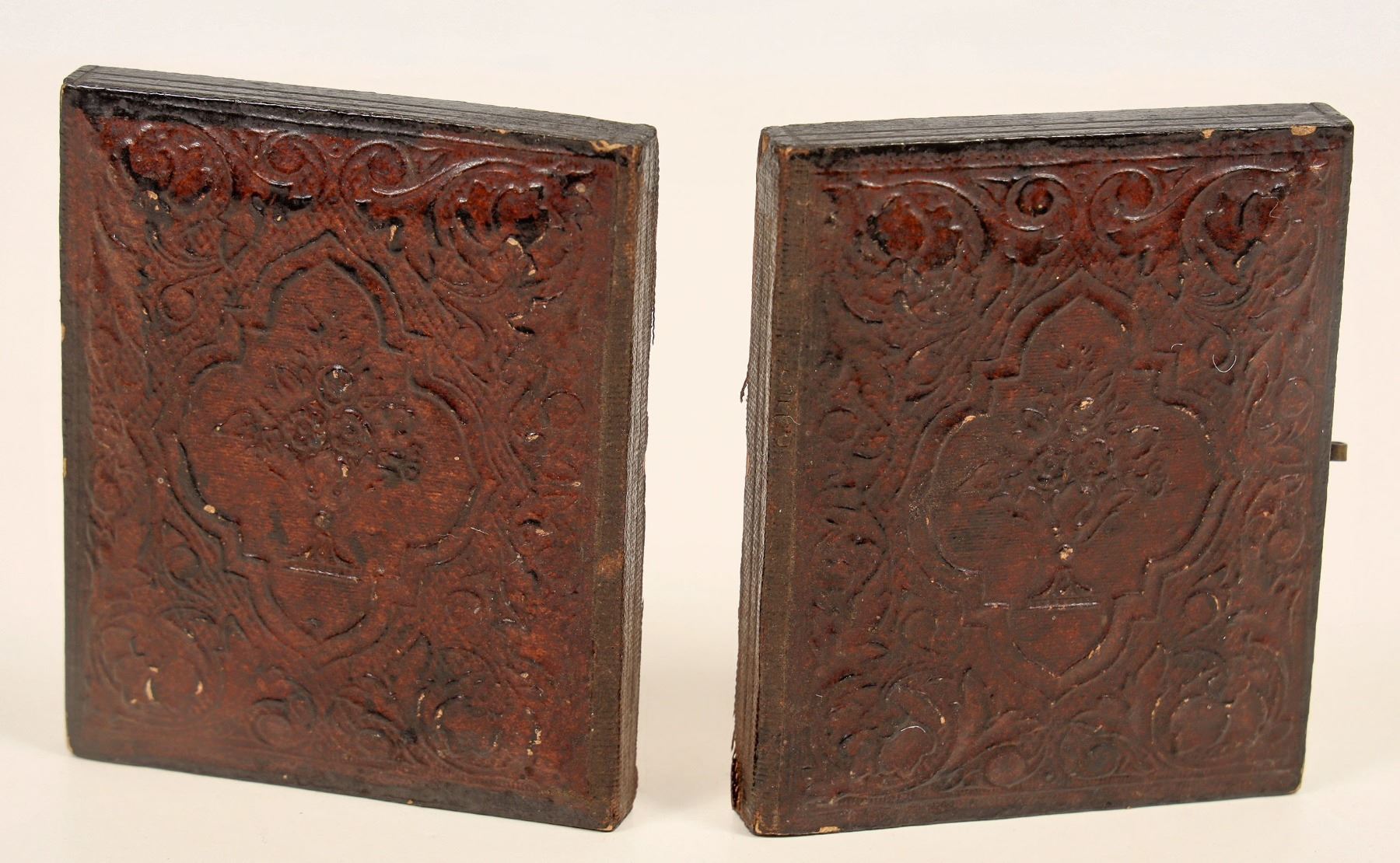 A duo of Ambrotype photographs of two gentlemen, c1850s-60s. Gold gilt mats. Each on an identical half case, no hinges or clasps. Nice pair. Both 2.25" x 2.75" x .25".