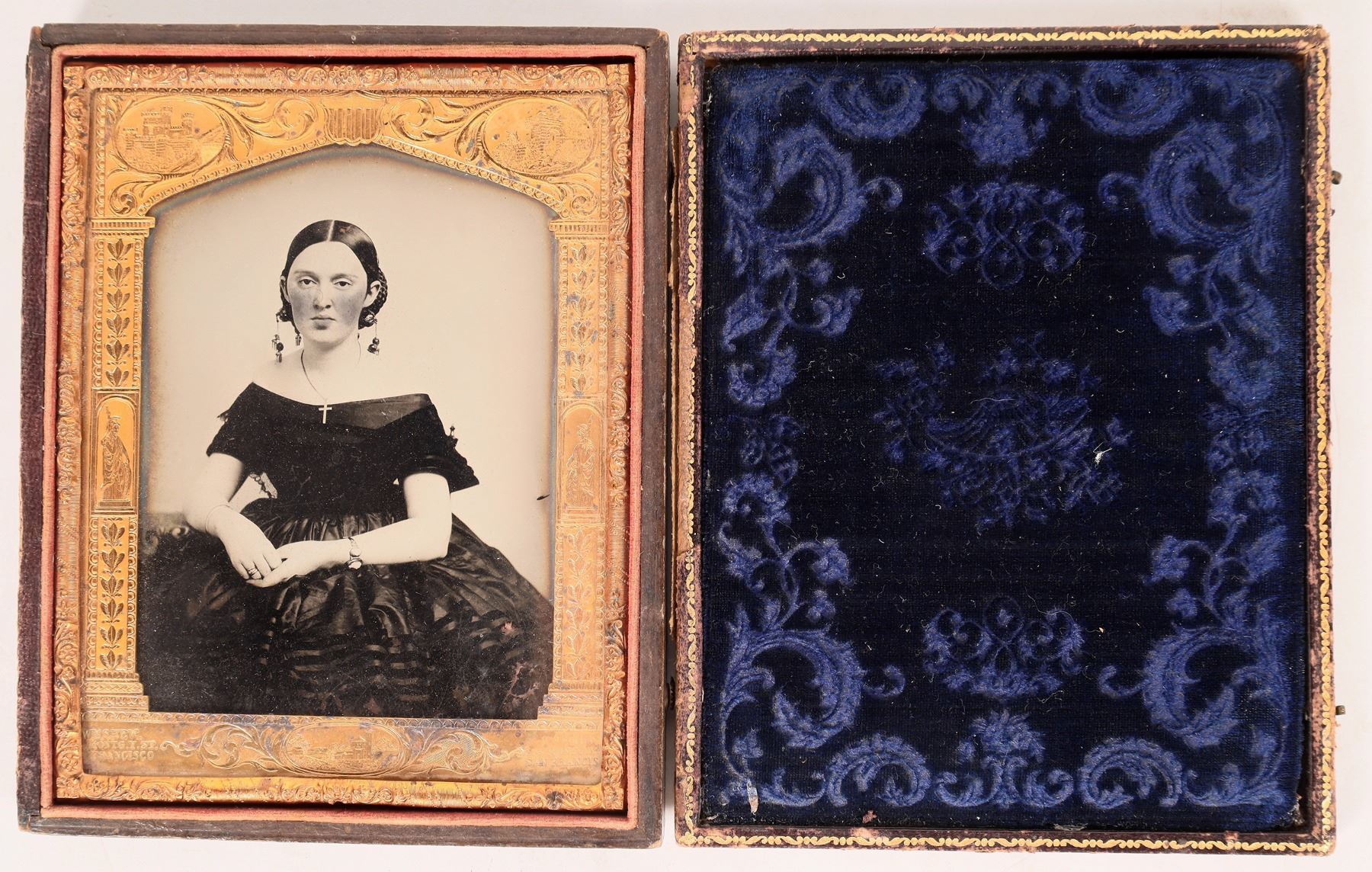 5.75 x 4.75". Framed, but frame cover is detached. Gold frame, marked in lower margin from his 113 Montgomery address. The photo frame must date to the 1855-1860 period, as Shew moved to expanded quarters after 1860.