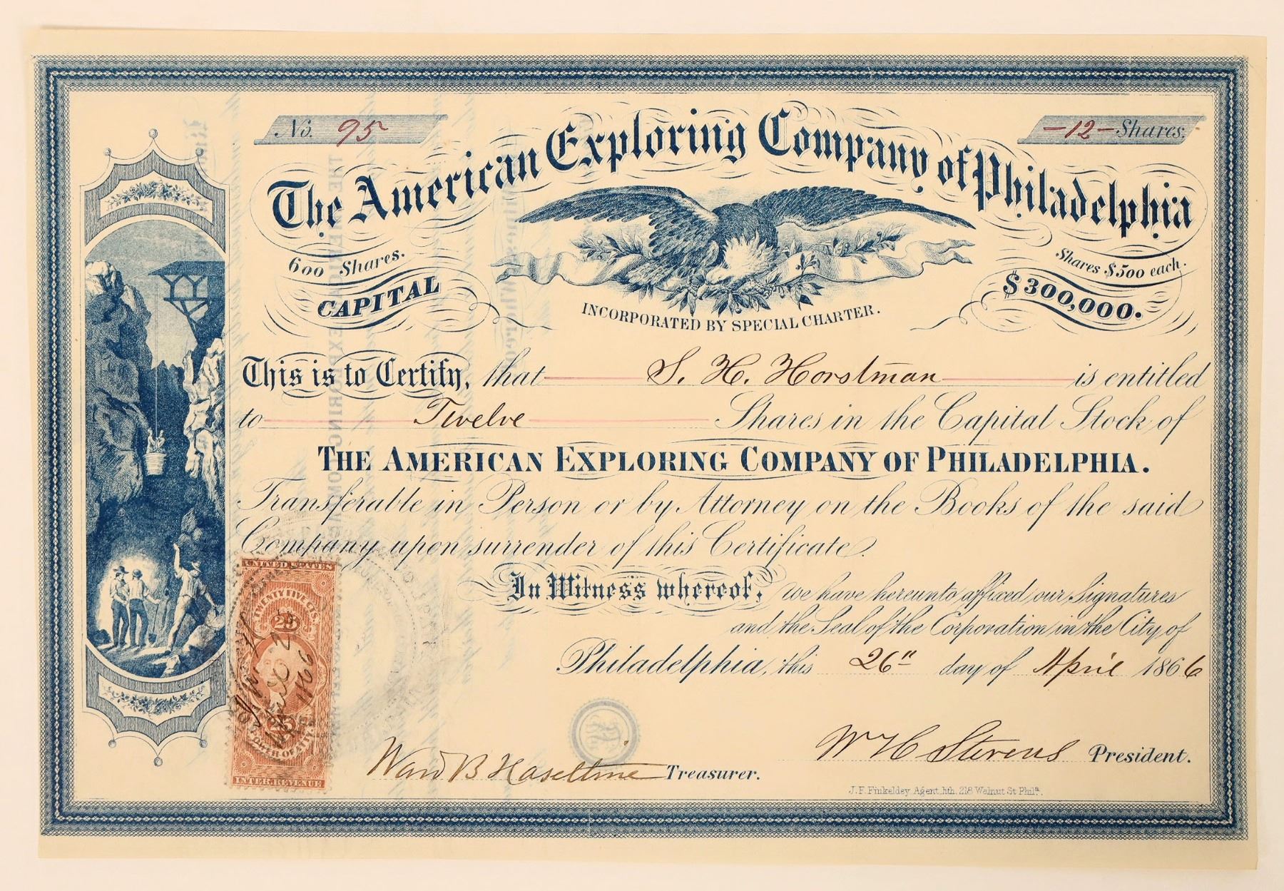 The American Exploring Company of Philadelphia stock certificate, c1866. Buckskin Joe, Fremont County, Colorado. One revenue stamp, No. 95, 12 shares. Interesting vignette of men being lowered in a bucket into a hole in ground. Signed by president and treasurer. By 1861, when the Laurette/Buckskin Joe Post Office opened, in the newly formed Colorado Territory, the town boasted two hotels, fourteen stores, and a bank. On January 7, 1862 the county seat of Park County moved to Buckskin Joe from Tarryall, now also a ghost town. At its peak, the town was credited with a population of 5,000. After 1866 mining diminished but the American Exploring Company of Philadelphia was formed to explore for more promising ore. The town of Buckskin Joe is well known as where Horace and Augusta Tabor had run a store and the post office there before moving on to Leadville, where Horace amassed a huge fortune. Silver Heels, the prostitute with a heart of gold, had reportedly nursed minors through an outbreak of smallpox here in 1862, then disappeared into legend. Although some of the town's more civilized residents had tried to name it Laurette, it could never shake the Buckskin Joe moniker inspired by Joseph Higgenbottom, the buckskin-wearing prospector who found gold in the area in 1859.