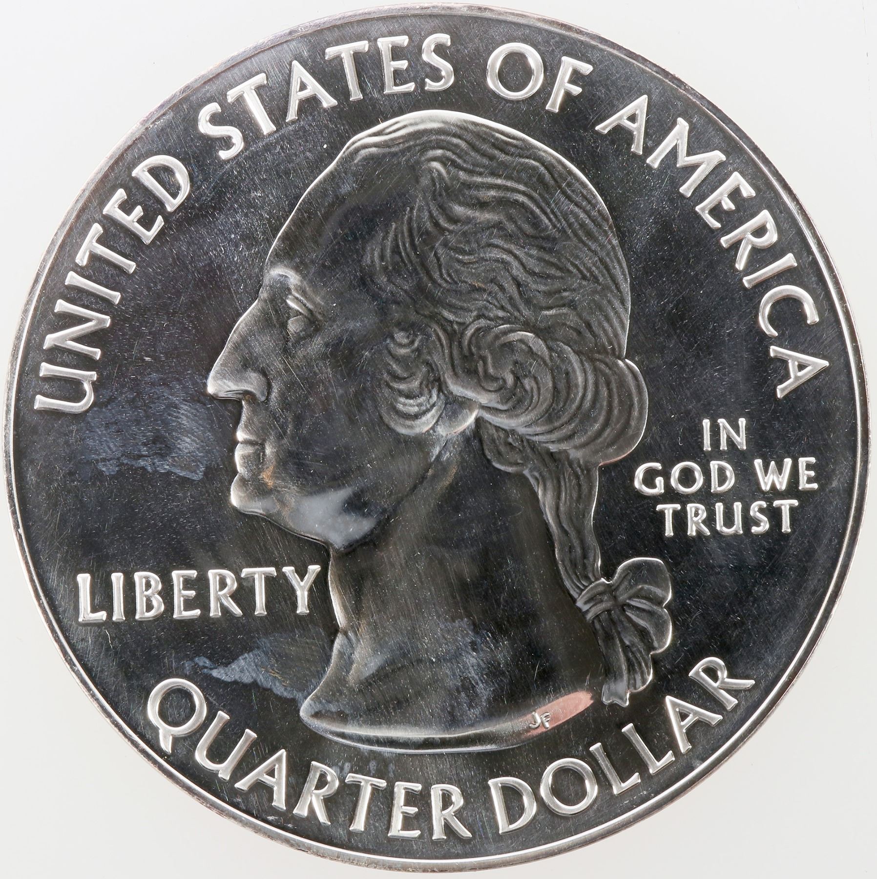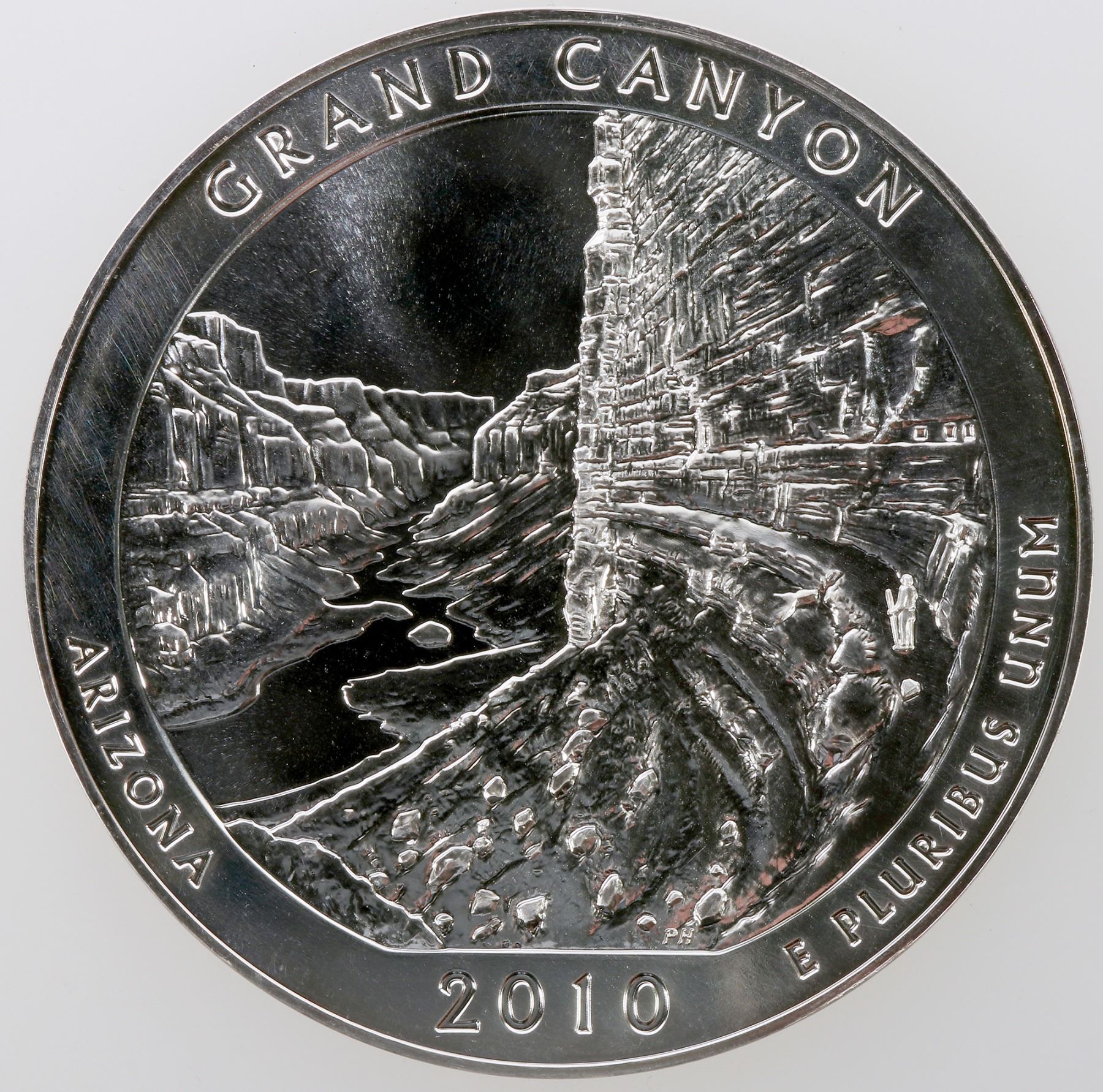 2010 Grand Canyon Arizona. Bullion coins contain five ounces of pure silver and have designs of the America the Beautiful quarters. Mintage of 33,000; 3 inches in diameter.
