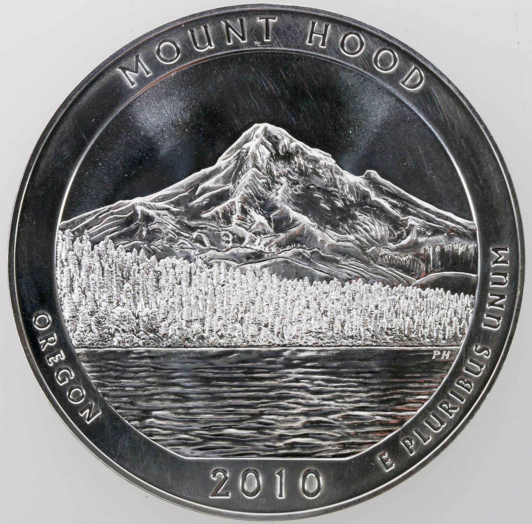 2010 Mount Hood Oregon. Bullion coins contain five ounces of pure silver and have designs of the America the Beautiful quarters. Mintage of 33,000; 3 inches in diameter.