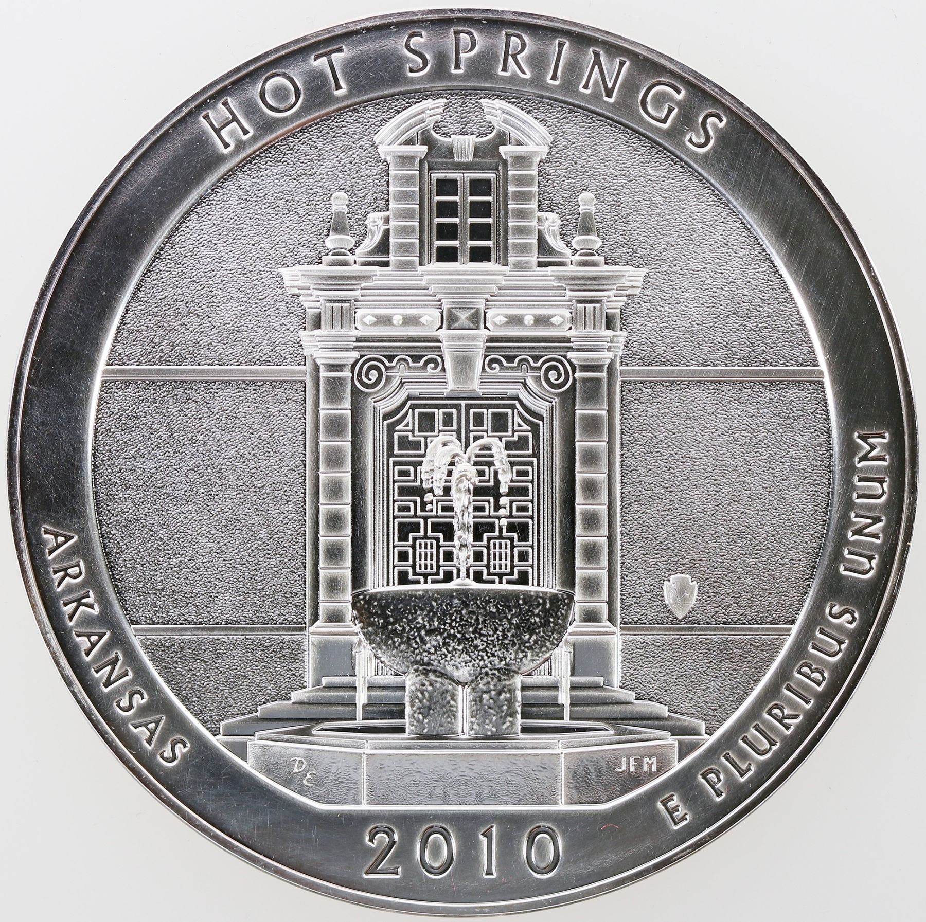 2010 Hot Springs Arkansas. Bullion coins contain five ounces of pure silver and have designs of the America the Beautiful quarters. Mintage of 33,000; 3 inches in diameter.