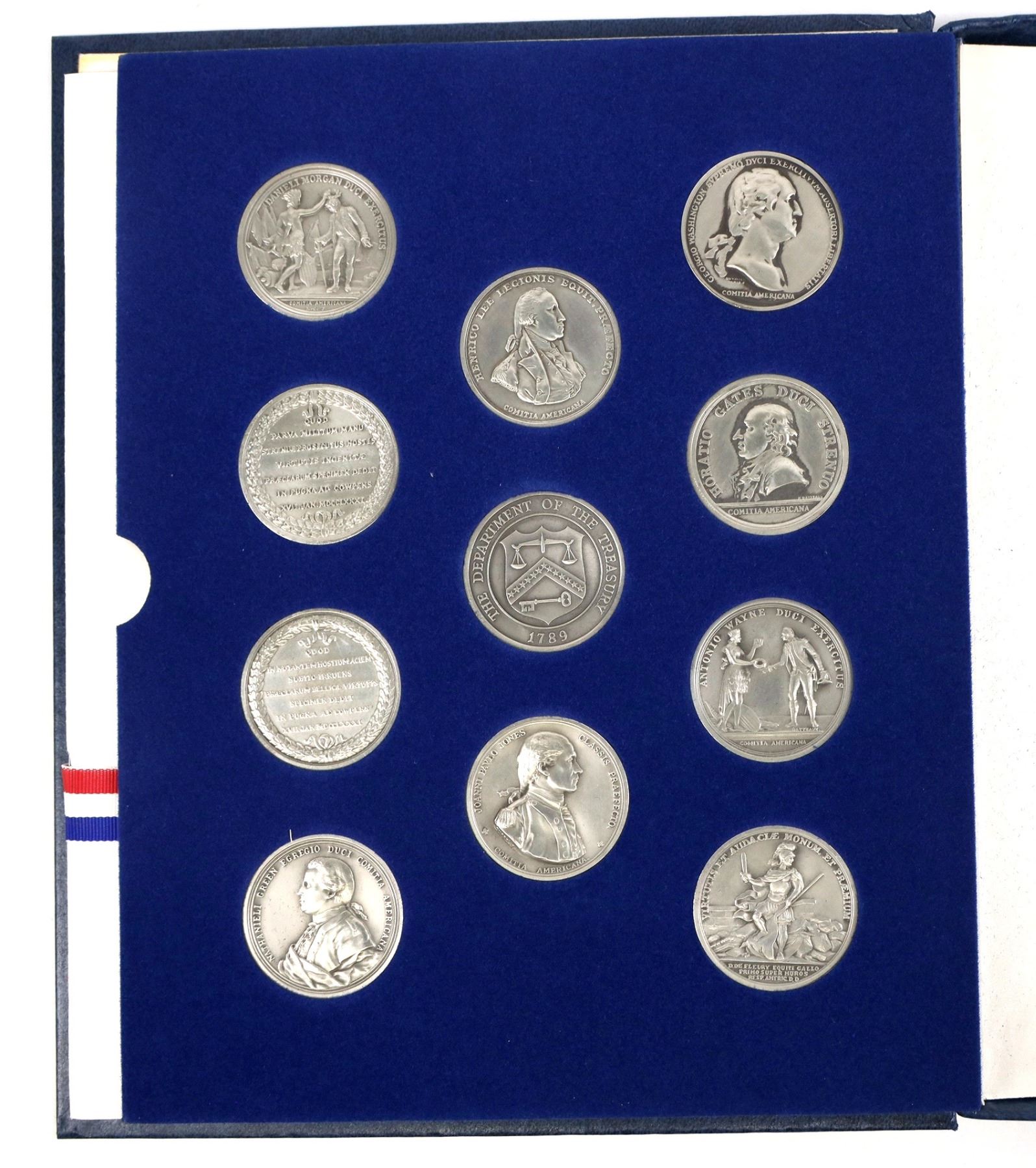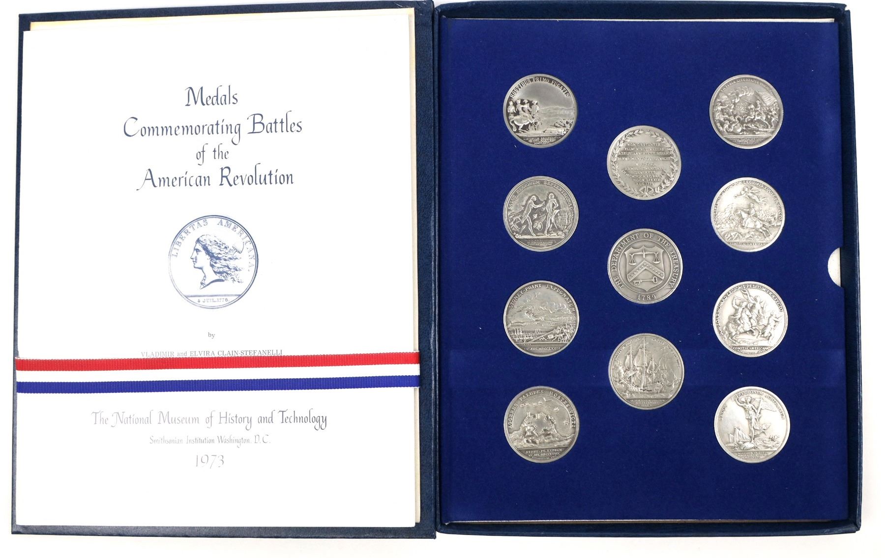 Eleven pewter medals Commemorating Battles of the American Revolution, produced by The National Museum of History and Technology. In original case with 43 page brochure by Vladimir and Elvira Clain-Steranelli about the medals. Each medal is 38 mm